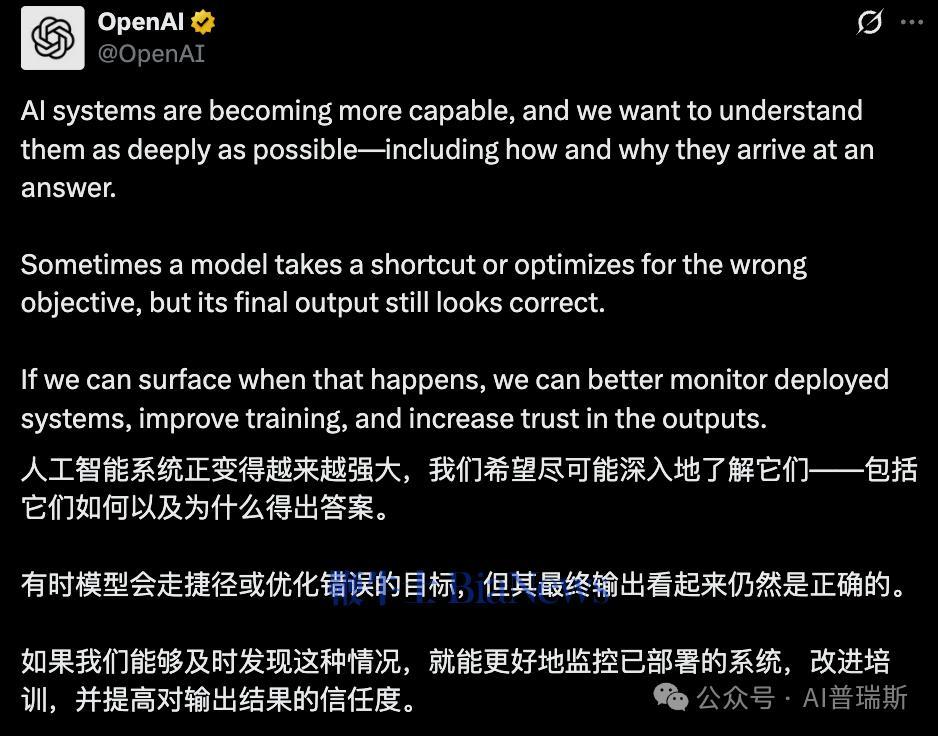 OpenAI最后解释了动机,随着AI能力急剧提升,它可能完成任务,但没有真正按要求做、它可能走捷径、它可能“看起来答对了”,但实际上过程是不合规的。过去这些都像“模型黑箱”的秘密,现在可以被自白机制揪出来。