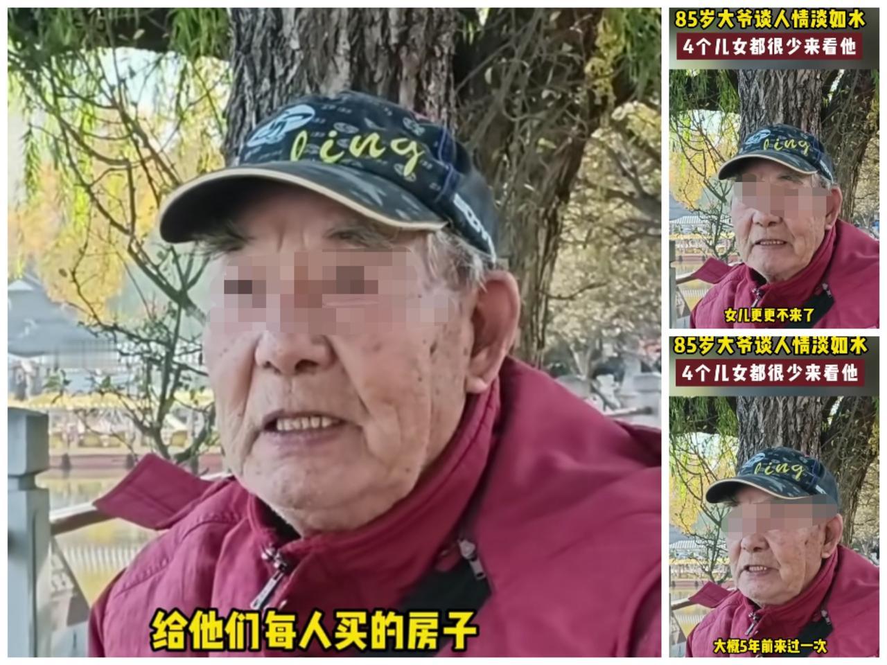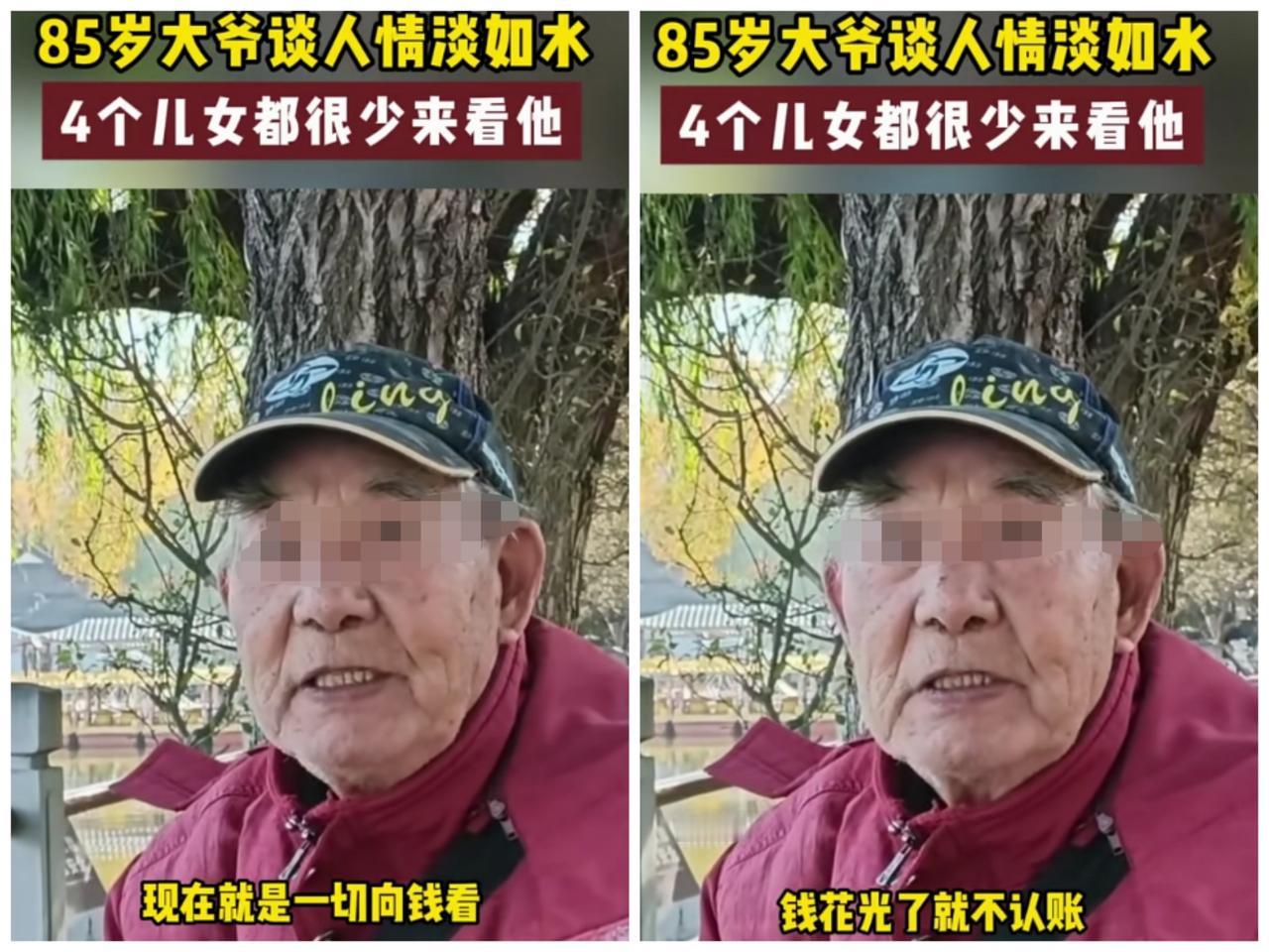 人情淡如水?南京一位85岁的大爷,育有三个儿子一个女儿,都很少来看他,最开始他还有意见,久了就看透了。 大爷说年轻的时候开了家小公司,挣了些钱,给每个子女都买了房和车,到老钱花完了,几个孩子都不管他,现在出个门溜弯,还是自己妹妹领着出来。 从大爷的讲述中,发现两个问题: 1、全程没提及老伴,猜测人不在了。 2、一个孩子不管有可能,四个孩子都不管,很可能是老人本身的问题。 大爷85岁高龄,儿女应该有50-60岁,60后70后子女大部分都很孝顺,特别是女儿通常都很心疼父母。 儿子不去看父亲还能想得通,但女儿也不回去看望就无法理解了,老人并没有说明原因,说即便是回来看他,也是谈卖房子的事。 抛开家庭教育和性格相处的原因不说,无非就是两大可能,一个是子女分配财产不均,一个是又找了老伴,把财产也分了给对方,惹孩子们不高兴。 大爷最后说道:“法律上可以让几个孩子管,但他们不执行也没办法,不管黑猫白猫,没有了钱,啥猫也不是”,言语间充满了无奈。 不能看片面之词,相信大爷的处境在几个子女口中说出来又是另一个版本,可以肯定现在有句话还是有道理的:“指望孩子养老,不如指望社保。” 世上人情淡如水 自私自利老人