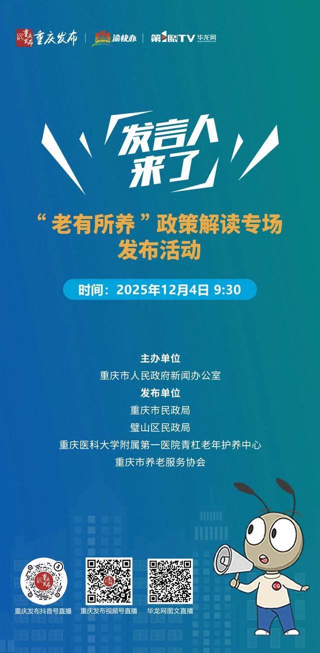保障老有所养,安享幸福晚年。12月4日9:30,由重庆市人民政府新闻办公室主办的“发言人来了”——“老有所养”政策解读专场发布活动将在璧山区举行。