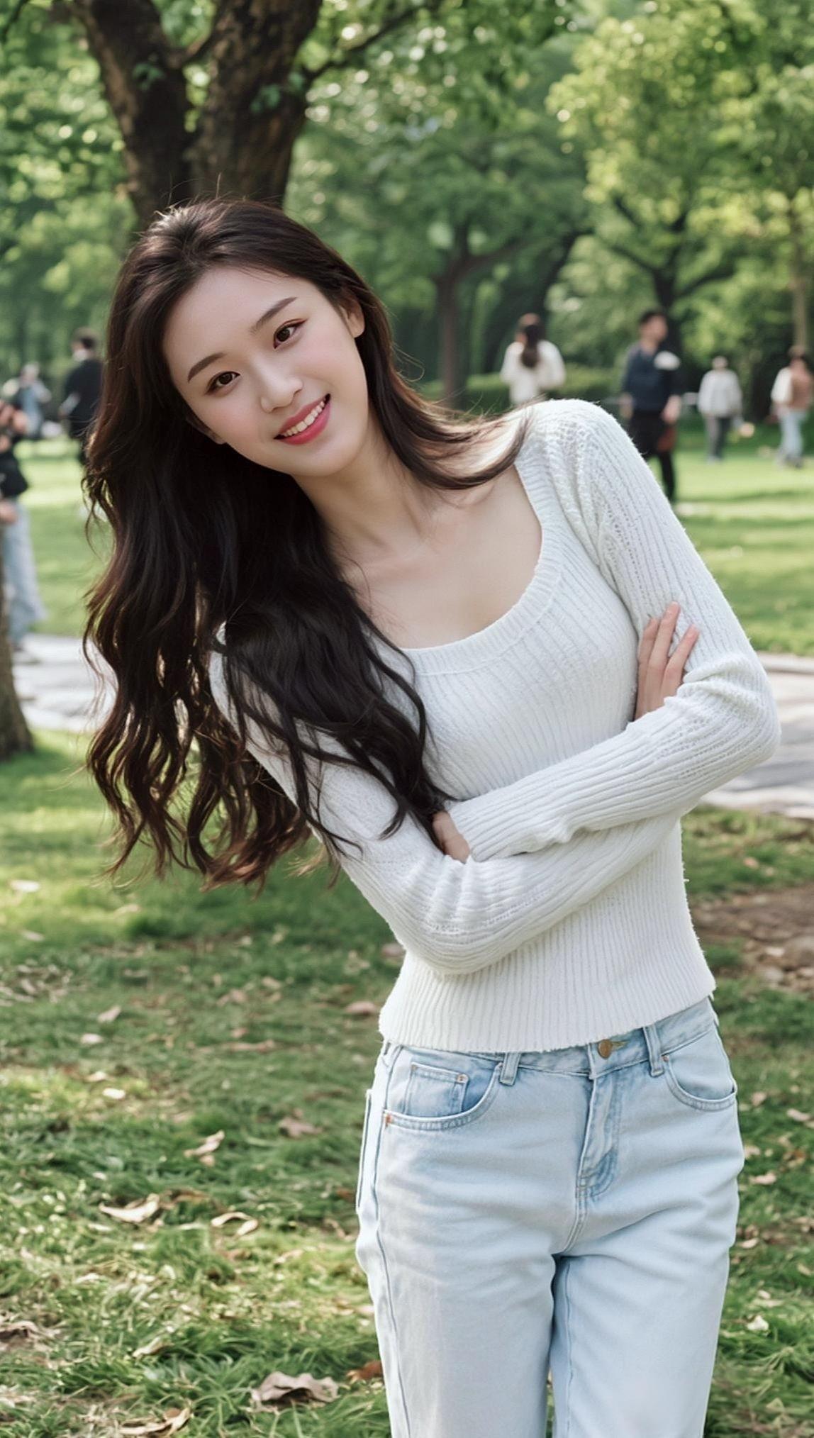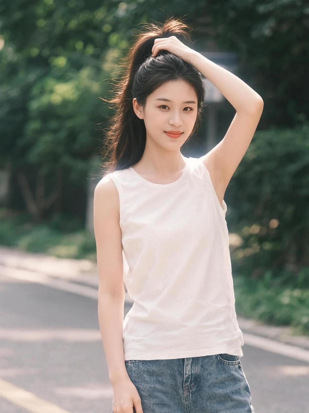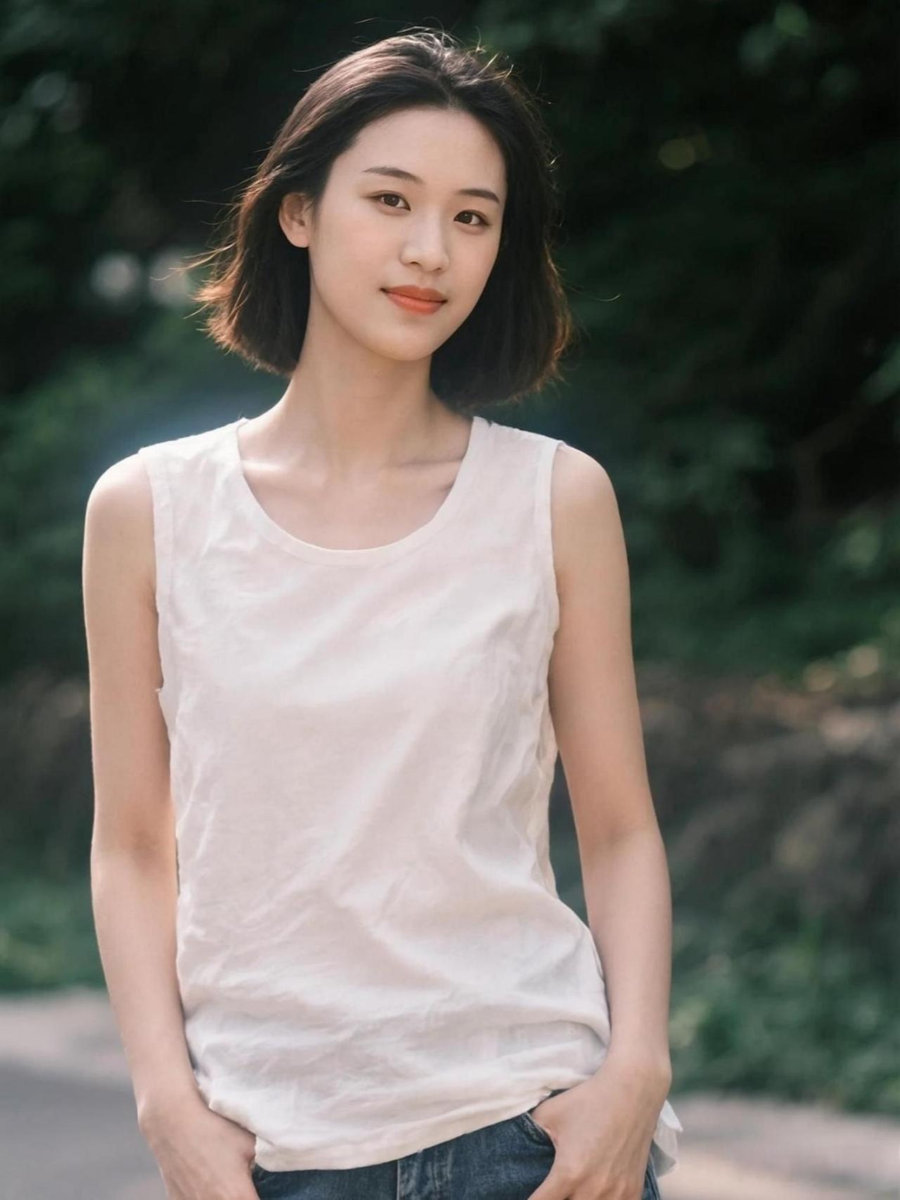 粉裙曳石畔,莲眸剪水,青丝随风舞,胜柳丝千般袅娜。荷塘鸭戏,村舍烟轻,独她立处,