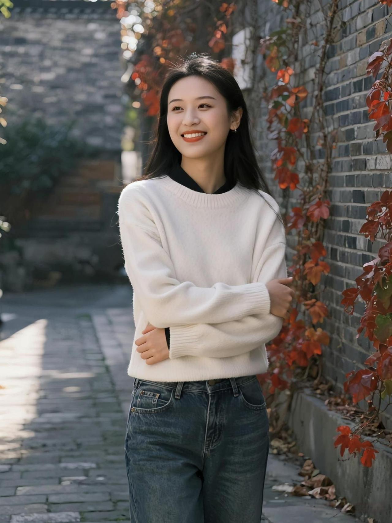 《晴野》 秋光匀作淡金纱, 素领柔衫衬鬓华。 腕底风轻拈碎发, 闲庭一杖惹流霞。 野趣漫步写真 秋韵街拍 秋装街拍 秋分街拍