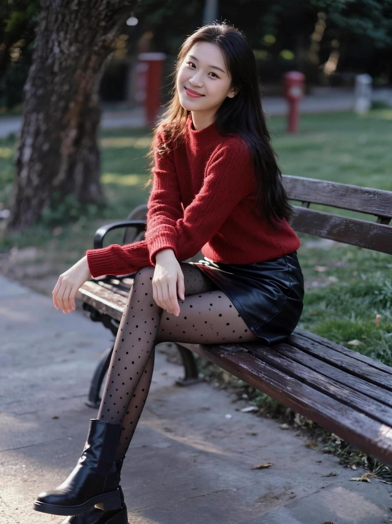 《秋阶》 暖衫裹得日微醺, 波点轻笼玉腿匀。 长椅斜依风里树, 笑涡藏住一园秋。