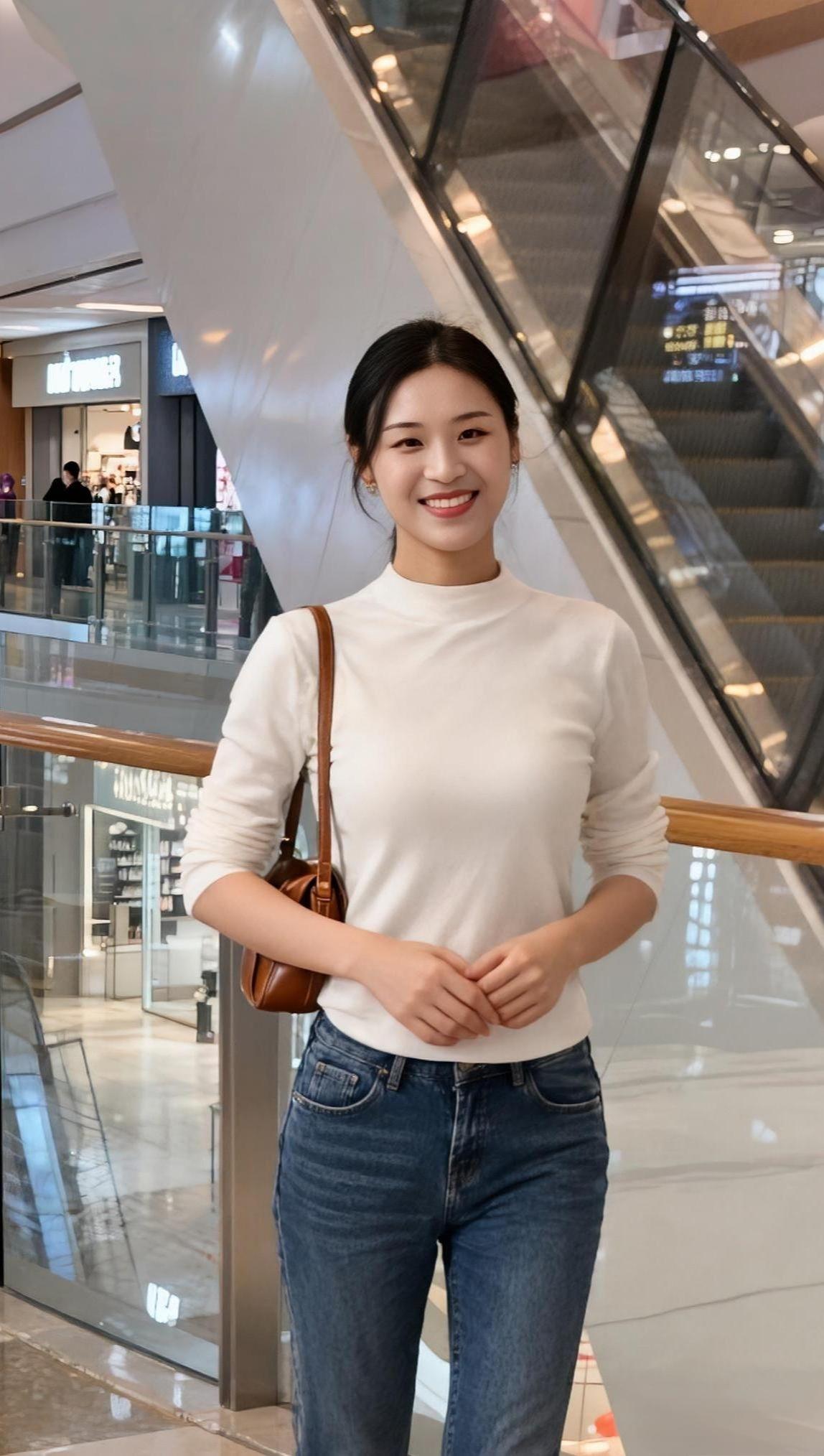 街拍即景 暖光浮掠素衣肩, 链挎棕囊意自闲。 凭遍璃栏人独立, 风捎烟火入眉弯。