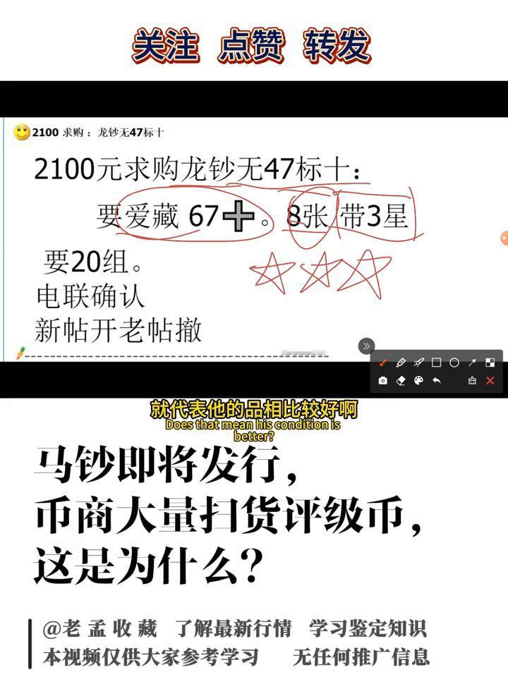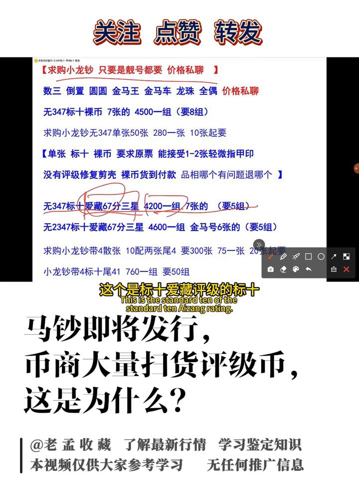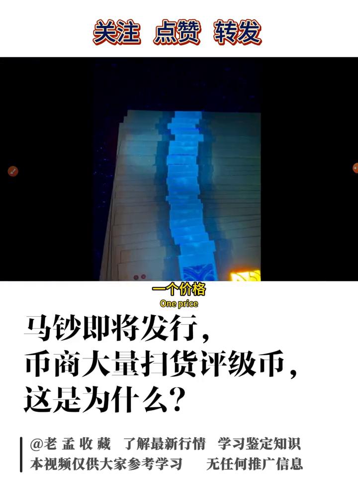 马钞即将发行,币商大量扫货评级币,这是为什么? 老孟收藏。 今天老孟给大家讲一下关于现在市场上收购龙钞以及蛇钞的行情。因为现在很多裸的没有评级,大家在荧光下可以看一下反应,它是有一些有流通产生的痕迹。像这些地方不光是单张的,像整百的封条是非常容易受潮的,只要一受潮就会有斑点,这种也是会非常影响价格的。 所以现在市场上收的大部分都是像这种标十,这种是爱藏的标十,它是竖的。还有就是标百,标百就是最早给大家看的,像这种就是龙钞的标百。标百可能每张不会给你发一个单独的图,但是像这种标十的荧光图都是会有的,就是像这种每张都会有。 这也是为什么现在市场上很多朋友都在收爱藏的评级,因为爱藏现在对于纸币评级这一块,尤其是龙钞、蛇钞、生肖钞市场上是非常认可的。爱藏在评级的时候,大家可以看一下,这有一个三星,这种三星也是一个更高级的认证。 像这个是分数吗?这个都不给大家讲了,之前也给大家讲过关于评级的一些东西。现在市场上收的主要还是标十,以标十为主,三星为一个必要条件。至于分数一般就是6768,很少了一般就是6768,像这个就是68加,就是非常好的品相了。这个是68分的,大家可以看一下现在市场上收的价格。 再给大家看一下,像这种就是蛇钞的,就是流通过程中产生的,像这种痕迹就会非常影响价格。像这个是蛇钞标十爱藏评级的,收的,这个是出的价格。像81-90的是8500,这个也是81-90,这个是881,这个里应该是有888,这个包子号,像这个688,它没有包子号,是卖3900,带7的是卖1200,它的价格差距还是非常大的。 但是大家要看到它是爱藏67+的,并不是68+,这个也是目前收购的行情,像67分的三星的是4200一组,这个是标十爱藏评级的标十,无2347的也是爱藏评级的,是4600。 大家可以看一下,这个也是目前的求购价,这个也是求购龙钞,无47标十,只要爱藏67+的,是8张的,应该是带三星。就是刚才给大家看的三个五角星,像这种也是更高级的认证,就代表它的品相比较好,这个是要20组,给大家看一下就行了。 目前市场上对于龙钞、蛇钞也好,大家收的还是这种评级的,因为裸币,如果不用紫外线去照,根本看不出荧光图的品相问题。 如果去买爱藏评级的像这种标十也好或者是标百,尤其是标十,每张都会有荧光反应图,所以更能清楚的去判断这张纸币的品相从而去购买。也不知道大家手里边收藏的龙钞也好,蛇钞也好,收藏的是标识还是标百,是裸的还是评级的。 如果是裸的一定要注意好防潮或者减少去用手碰或者去用指甲划,因为很容易就出现这种斑点,这种对于价格的影响是要非常大的。