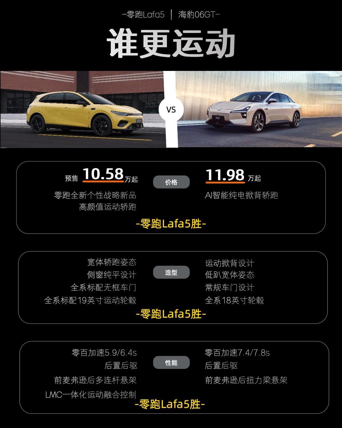 年轻人第一台纯电车,选零跑Lafa5还是小鹏M03? 既然是年轻人买车,颜值与操控必然是重点关注,当然必要的品牌稳定可靠也是要看的。基于此,在新势力圈子,近期上市即出圈的零跑Lafa5以及持续热销的小鹏M03可以重点了解一下。 先看颜值,Lafa5采用轿跑运动造型,具备无框车门+掀背车身,M03则是传统三厢轿车造型,采用有框车门,相比之下,明显是Lafa5更符合年轻人审美。 再看操控,Lafa5基于后驱+双独悬打造,采用中欧联合调校,配合50:50轴荷比、前窄后宽轮胎、5.17m转弯半径等,带来扎实且灵活的操控。M03采用前驱与扭力梁非独立后悬,更偏向舒适家用。包括动力,Lafa5完成0-100km/h加速只需6.4s,优于M03的7.4s。 智能也是当下关注的热点,M03全系均为8155座舱,而Lafa5 Max版开始升级为8295座舱,算力更强,交互响应更敏捷。辅助驾驶方面,Lafa5搭载激光雷达+8650芯片,城区、高速均具备端到端能力,与小鹏XNGP辅助驾驶持平。 不过,Lafa5目前限时惊喜价仅9.28万起,大大低于M03的11.98万起,品价比更加出众。要注意的是,Lafa5惊喜价月底结束,建议想买的朋友趁早下手。