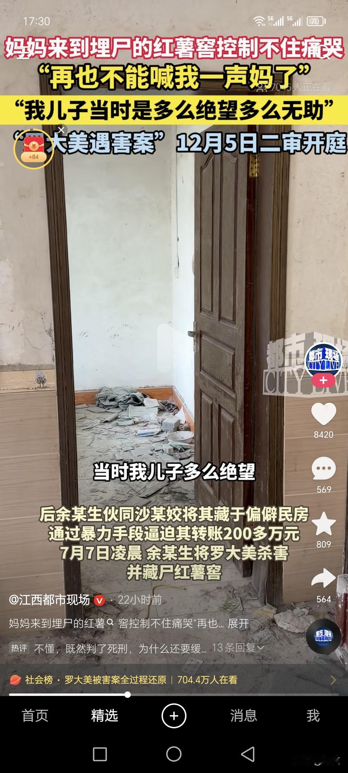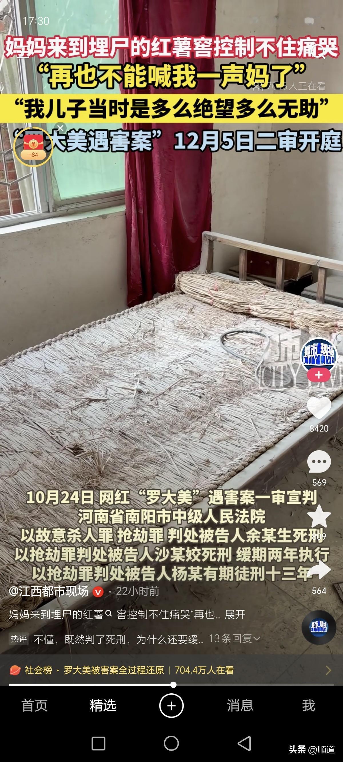 这是已遇害网红罗大美的妈妈。儿子二审将于12月5日开庭。 12月3日,想念又心疼儿子被惨痛杀害,来到儿子遇害的红薯窖痛哭不止。 哭诉儿子当时怎么求他们都不好使,凶手已经红了眼。 一审判两人死刑,还来个缓期两年执行,一个才判13年。 罗大美的家人怎么能接受呢?抢劫人家200多万,控制人家好几天,最终还要了人家命。 这都不是死刑立即执行。 家属不服才上诉啊。