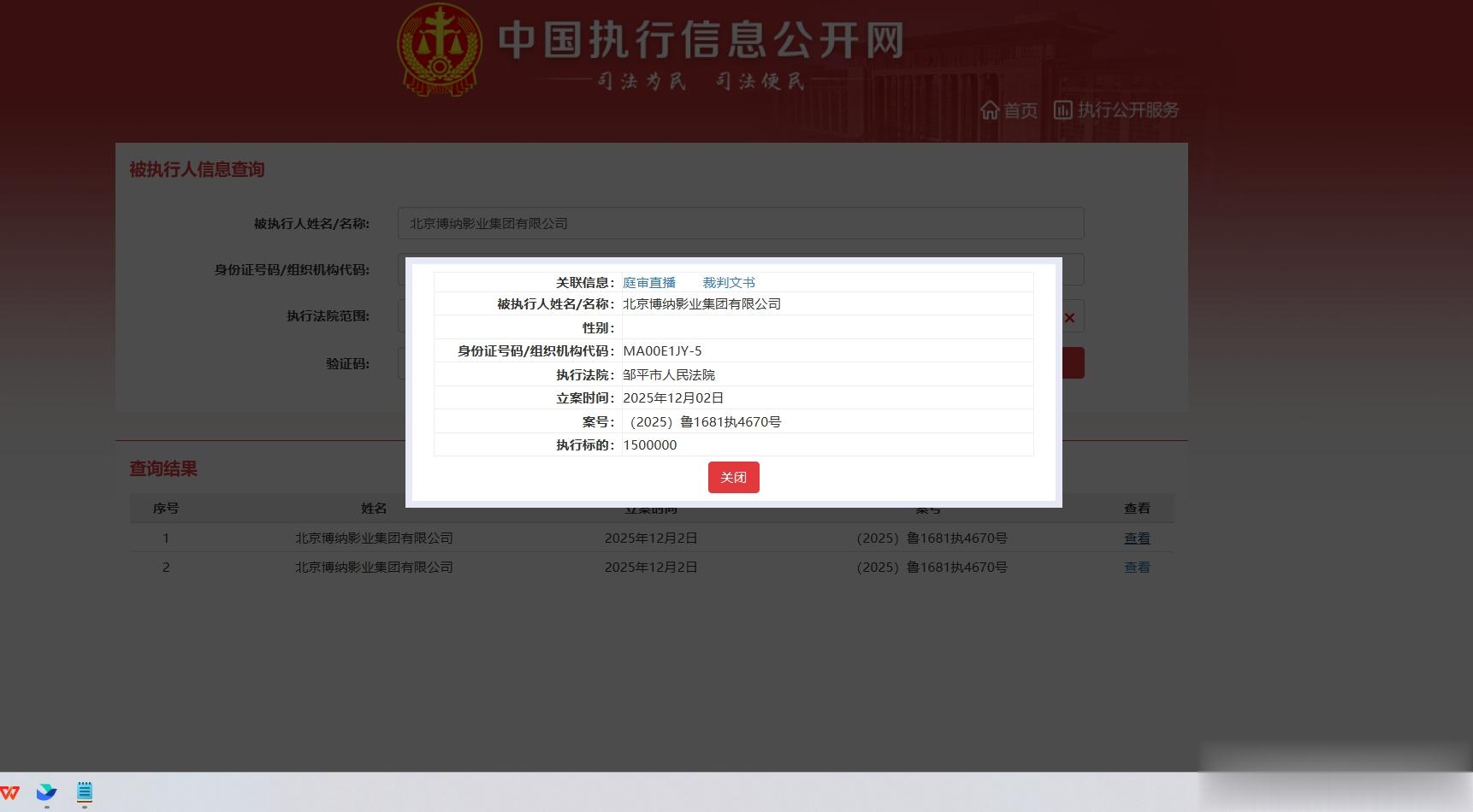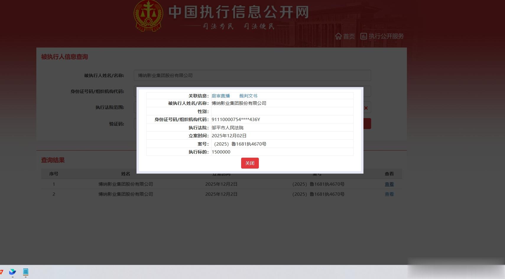 [#博纳影业及一子公司成被执行人#]中国执行信息公开网显示,博纳影业集团股份有限公司、北京博纳影业集团有限公司成被执行人。具体来看,上述两公司新增被执行人信息,执行标的150万元,执行法院为邹平市人民法院,立案时间为2025年12月2日。北京博纳影业集团有限公司为博纳影业子公司。据博纳影业半年报,该子公司主要业务为影视制作、发行,注册资本8000万元。博纳影业在半年报中称,子公司北京博纳影业集团有限公司本期净利润较上年同期下降较大,系2025年投资上映影片票房表现不佳,导致公司本年盈利情况下降。