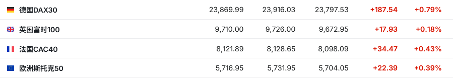 2.截至发稿,德国DAX指数涨0.79%,英国富时100指数涨0.18%,法国CAC40指数涨0.43%,欧洲斯托克50指数涨0.39%。