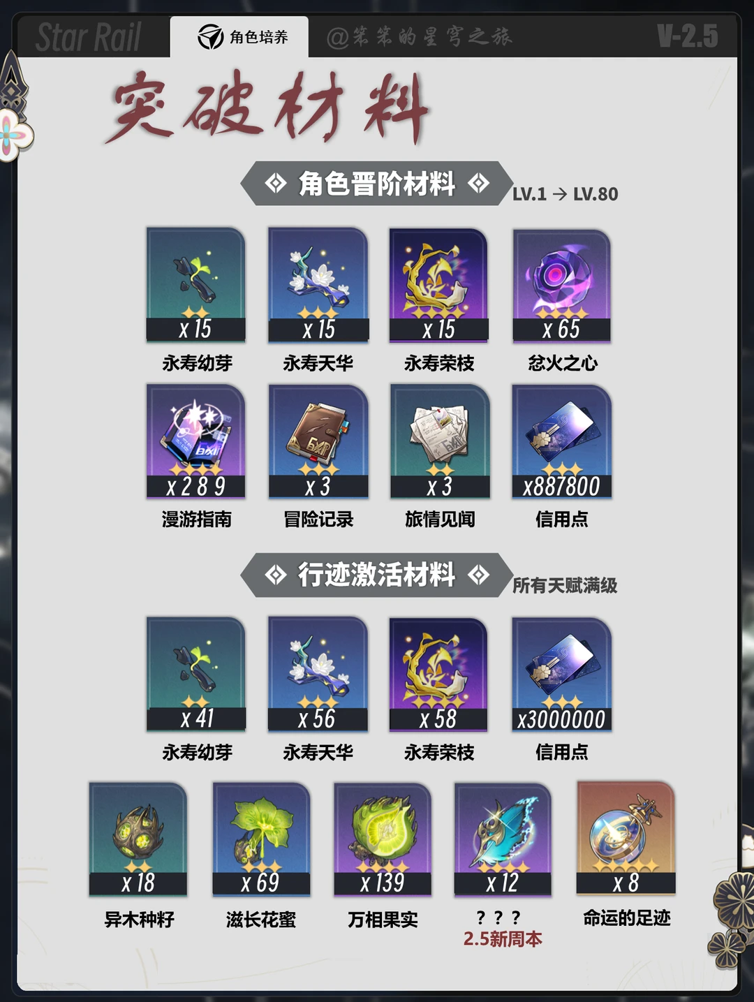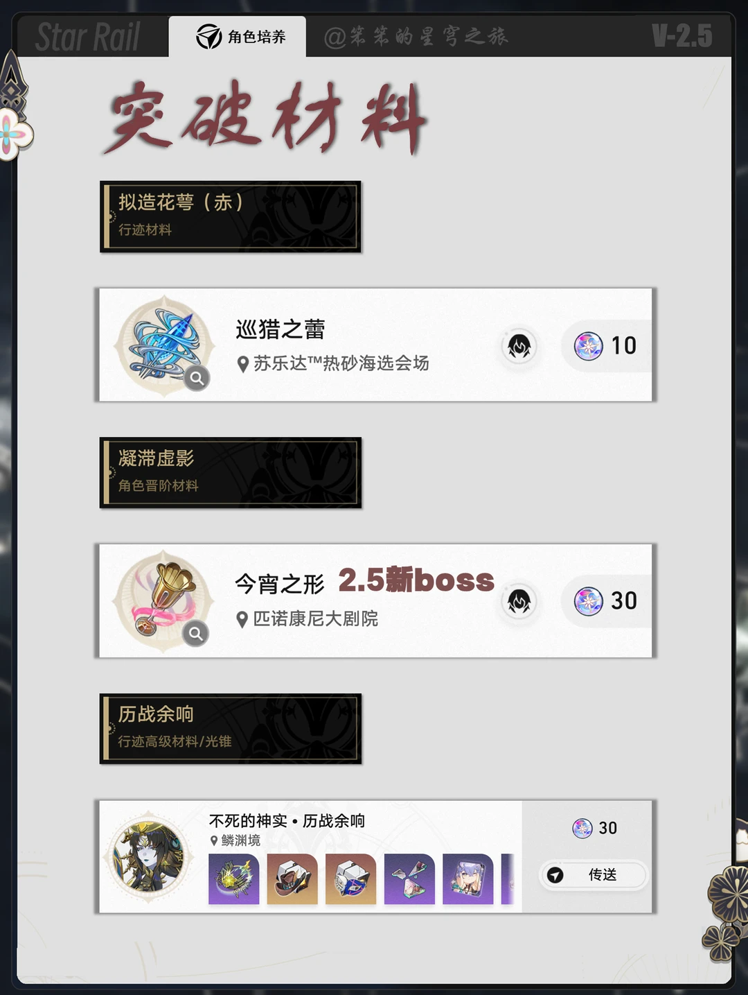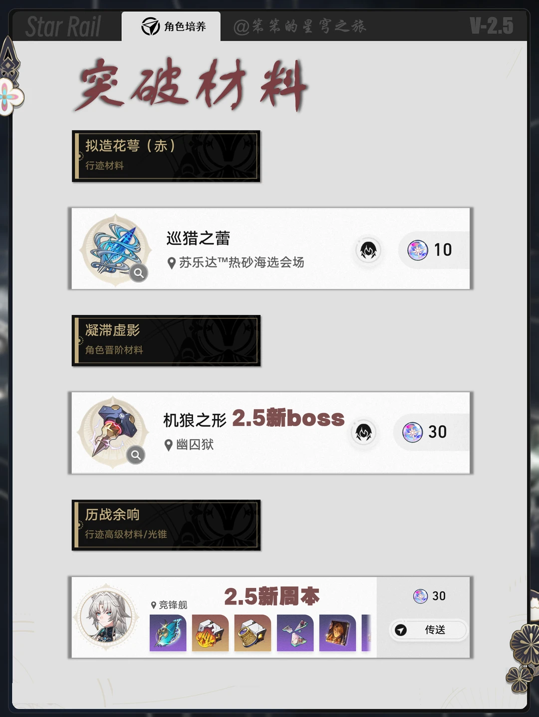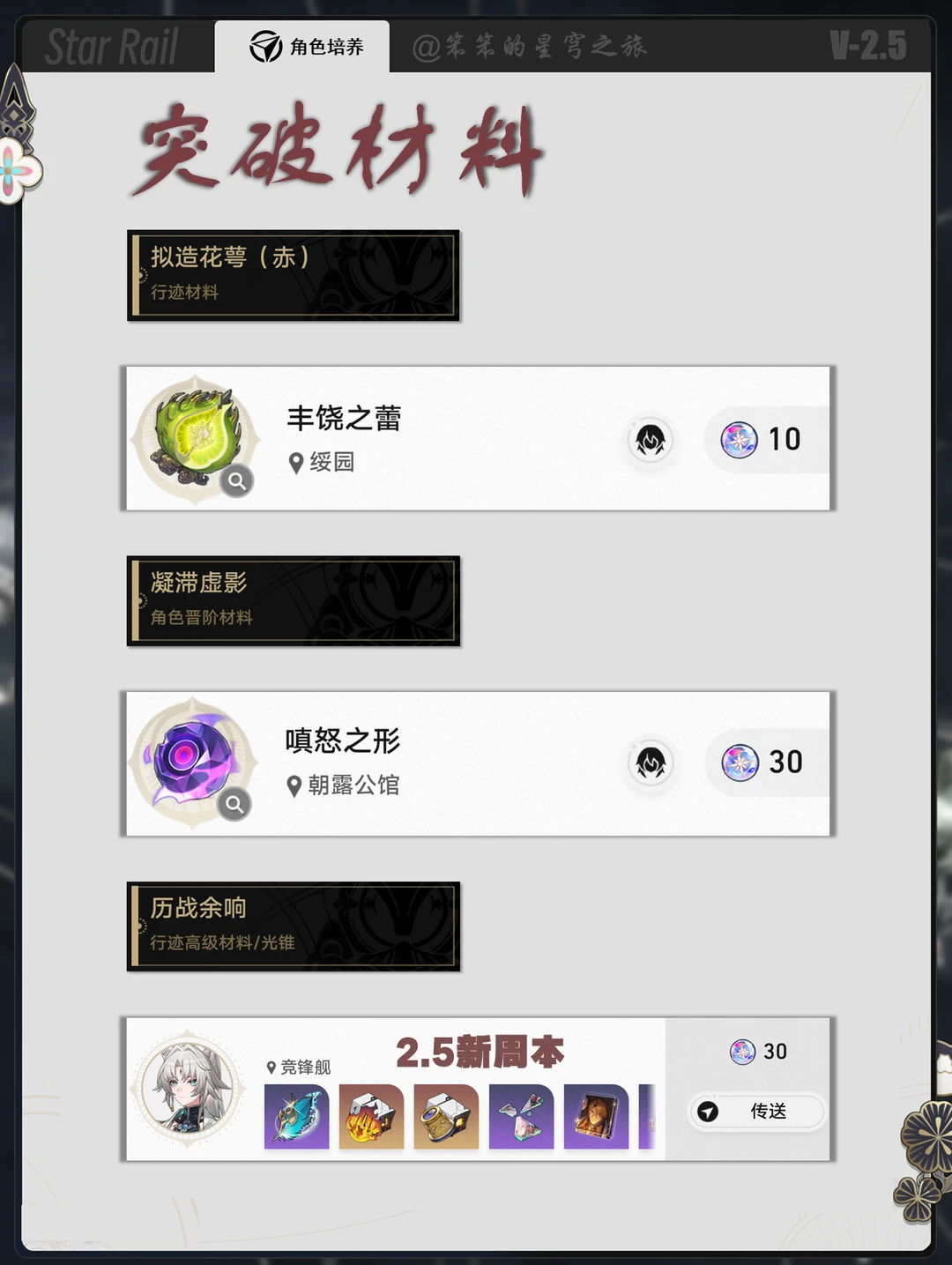 🐱大家好,我是笨笨的铲屎官 今天给大家带来的是2.5新角色 飞霄、灵砂、貊泽的晋阶材料 有需要的开拓者可以提前准备起来了