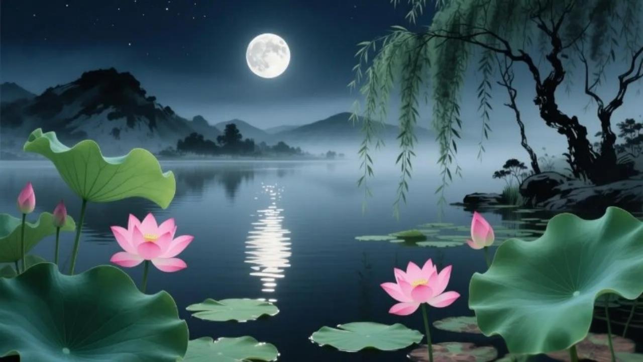 荷花荷塘风景图片分享月浸荷塘碎玉光,柳垂岸渚裹清芬。荷香浮夜山衔静,一枕幽凉浸此