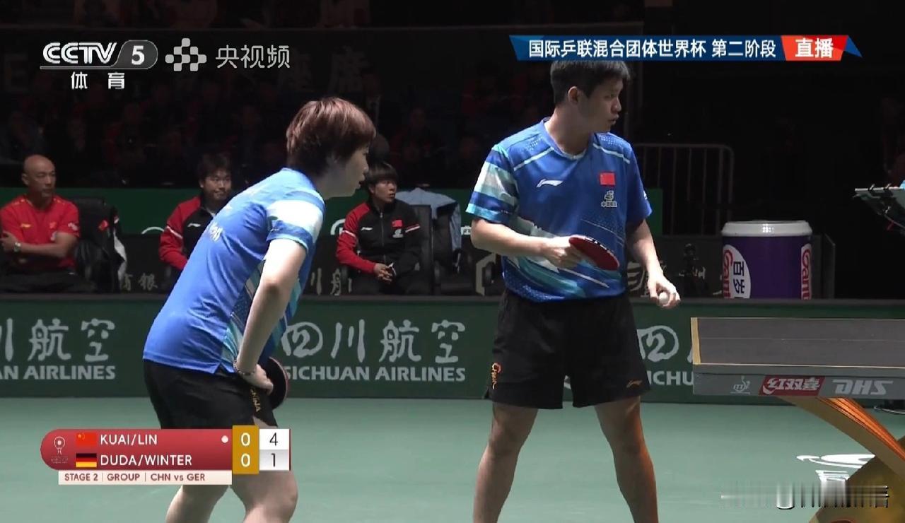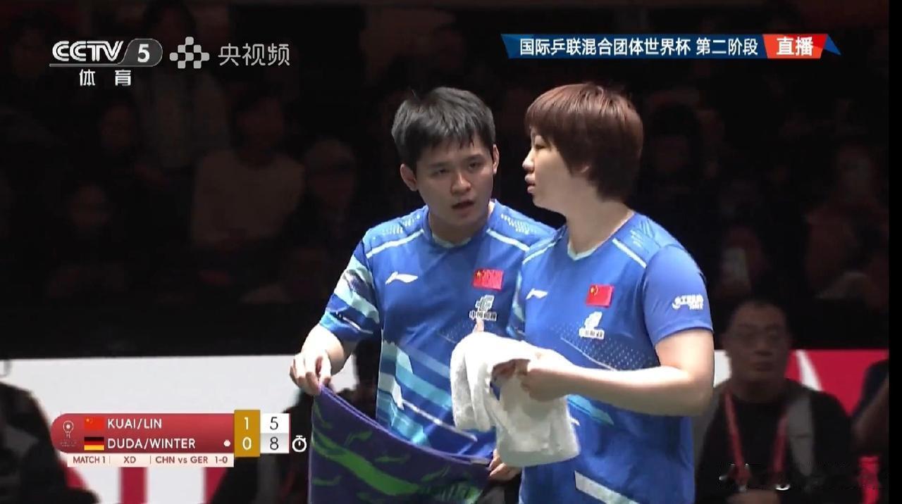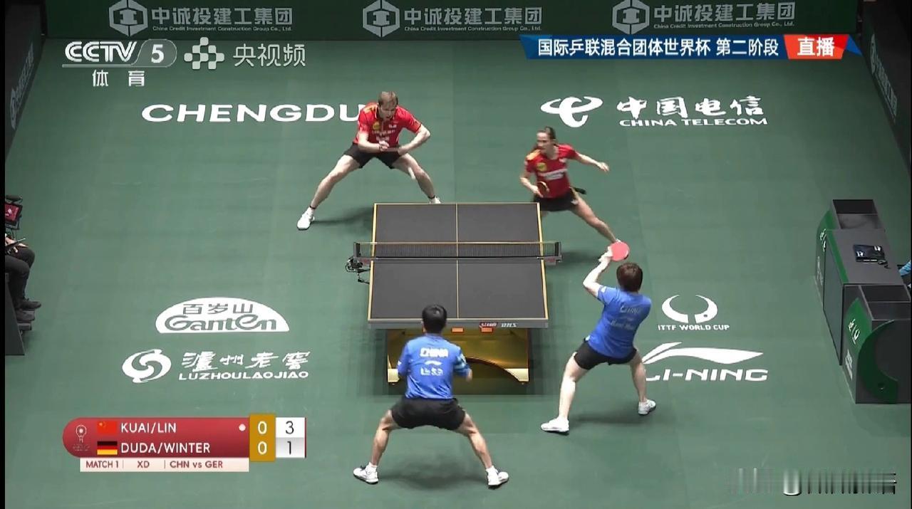 今天林诗栋/蒯曼打第一盘混双。 赛前训练时,看到给栋曼陪练的是袁励岑/白思文,因为今天德国队的混双组合是杜达/温特,温特是特殊打法。看到今天中国队是穿了蓝色的比赛服,林诗栋/蒯曼第一局打的还是不错的,以11-6先胜一局,局间听到肖导跟他们说打的很好。成都混团的比赛,中国队混双是王楚钦/孙颖莎和林诗栋/蒯曼替换着上场了。 比赛来到第二局,注意温特来回倒板,温特是换成了防弧来发的,这局打的很快,德国队是打了个7:0的开局,解说说中国队主要是在前三板上失误了,林诗栋/蒯曼是连追了3分。这局德国队的温特打的挺好的,带着杜达打,栋曼把比分追到5:8时,德国队叫了暂停,看来是很想拿下这一局的。 暂停之后,林诗栋和蒯曼也有交流了,栋曼组合是把比分追到了7:9,杜达/温特是10:7先拿到第二局的局点,栋曼打的也很顽强,从0:7落后一路追到了10平,太不容易了,最终林诗栋/蒯曼是12-10逆转赢下,目前中国队大比分2-0德国队。接下来还有一局果然,继续加油,第二盘女单是孙颖莎对阵尼娜,莎莎也加油!