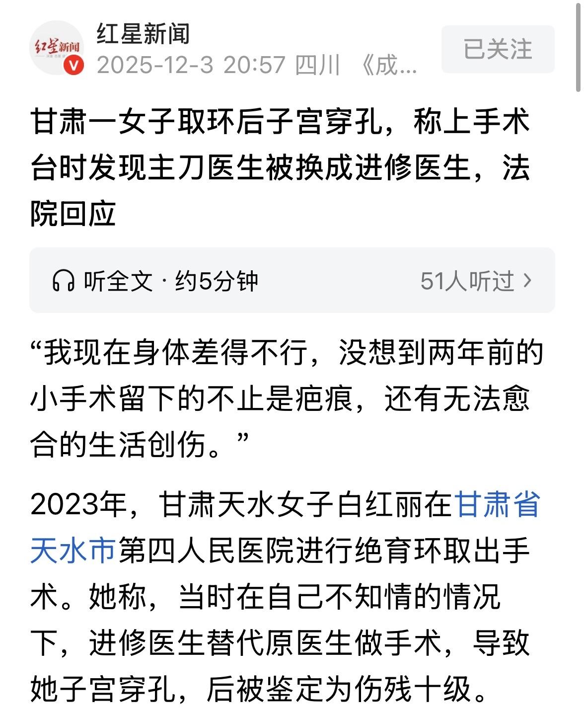甘肃天水,30岁女子去医院做节育环取出手术,谁料,院方竟在她不知情的情况下,把原本经验丰富的医生换成了进修医生,直接导致她术中子宫穿孔,术后多处器官粘连,不仅做手术成了家常便饭,夫妻关系也面临破裂,然而,院方始终不肯承认他们换了医生。 2023年7月,白红丽决定去医院把身体里的节育环取出来。 这说起来也不算大手术,但她心里不踏实,毕竟是个手术,总有风险。 不过她心里有个信任的医生,那就是给她看过多年病的妇科主任。她想让这位主任给她做,总觉得熟人更安心点。 到了医院,她跟护士说明了情况,然而,护士推荐了另一位马医生,说经验也很丰富。 白红丽寻思,既然护士都这么说了,医院也打包票说医生有经验,那就听安排吧。 手术同意书上签了字,是马医生签的,也跟她讲了手术可能有的风险。院方那边还安慰她,让她放心。 可白红丽万万没想到,从她躺上手术台那一刻起,事情就完全不对了。 推进手术室,她发现主刀的压根不是之前说好的马医生,换人了! 手术开始了,负责的医生是来医院进修的蒲医生,白红丽清晰地记得那第一下操作带给她的剧痛。 蒲医生第一钩下去,她半个身子都麻了,接着就是腰疼、肚子疼!那疼痛感排山倒海,手术根本没法往下做,只能中途停下。 下了手术台,白红丽依然感觉肚子里像有刀在绞,疼得她直冒冷汗。 她忍不住求医生给点止痛药,可医生却很无所谓,觉得她就是对疼痛太敏感了,忍忍就过去了。 白红丽强撑着走到医院一楼,实在是一步也挪不动了,她赶紧给之前负责她的医生打电话求救。 就在这时,陪她来的丈夫发现她眼睛都散了,直翻白眼。 后来她才知道,自己这个时候已经处于休克状态了,很危险。 情况危急,她才刚从手术室出来,转头又被火速送进了重症监护室抢救。 直到这时,惊心动魄的真相才被揭开。她的手术出了大问题,医生诊断是手术造成子宫穿孔,引发了严重的大出血。 这哪里是小小的取环手术?这简直是要命了!白红丽通过法院,找了专业的鉴定机构。 外省一家司法鉴定所给出了结论:医院给她做手术的过程有问题,存在过错。而且这个过错和给她造成的伤害直接相关,是主要原因。 这鉴定结果,算是一锤定音。 然而,这场灾难性的手术,仅仅是白红丽漫长痛苦的开始。 接下来的2年,因为那次手术造成的严重创伤,她的盆腔、子宫、输卵管,连肠道都粘连到了一块儿。 为了处理这些粘连,她一次又一次地躺上手术台,每一次过程都相当遭罪。多次的手术,在白红丽的肚皮上留下了一道又一道疤痕。 身体的变故,让她和丈夫的感情也走到了尽头,婚姻只剩一个空壳。 出了这么大事,白红丽最初的想法还是尽量和医院商量解决,她不想闹得太僵。但医院根本不承认有进修医生给她动了刀。 蹊跷的是,她想查看当天手术室的监控录像,想弄清楚到底发生了什么,院方却说时间太长了,监控覆盖了,没了。 2023年8月,这个案子第一次在法院开庭。法庭上,对方还辩解说是白红丽自己赖在医院不走,这简直是睁眼说瞎话。 而最让她无法释怀的问题始终是:换医生,这么大的事,为什么不告诉她?不经过她同意? 为了更准确地确定伤害程度,法院后来委另一家司法鉴定中心再做鉴定。 2025年6月出炉的报告确认:白红丽因为那次子宫穿孔修补手术,身体构成十级伤残。 报告还明确指出,她现在还患有妇科疾病、盆腔积血等问题。最关键的是,当时给她做取环手术的,就是那位进修医生蒲医生,医院的谎言不攻自破。 如今的白红丽,在娘家养病,她身体垮了,没法工作,生活来源主要靠亲戚朋友接济,日子过得非常艰难。因为身体太虚弱,她有时只能把食物榨成汁喝下去。 离婚的念头在她心里盘旋过无数次,但看着两个还小的孩子,她犹豫了,下不了决心。孩子们现在跟着父亲生活。 时间一天天过去,煎熬也在持续。她现在的愿望很实际:希望医院能负起责任,承担她后续治疗需要的大笔费用。 那么,从法律角度,怎么看待这件事? 《民法典》第1219条规定:医务人员在诊疗活动中应当向患者说明病情和医疗措施。需要实施手术、特殊检查、特殊治疗的,医务人员应当及时向患者具体说明医疗风险、替代医疗方案等情况,并取得其明确同意。医务人员未尽到前款义务,造成患者损害的,医疗机构应当承担赔偿责任。 医院擅自将主刀医生更换为进修医生蒲某,且未在术前或术中向白红丽告知这一重大变更。这属于“未取得患者明确同意”的情形,侵犯了患者的知情权与选择权。 司法鉴定已确认医院诊疗行为存在过错,医院需对此承担赔偿责任。 对此,你怎么看? 关注@运良说法. 学法律知识不迷路
