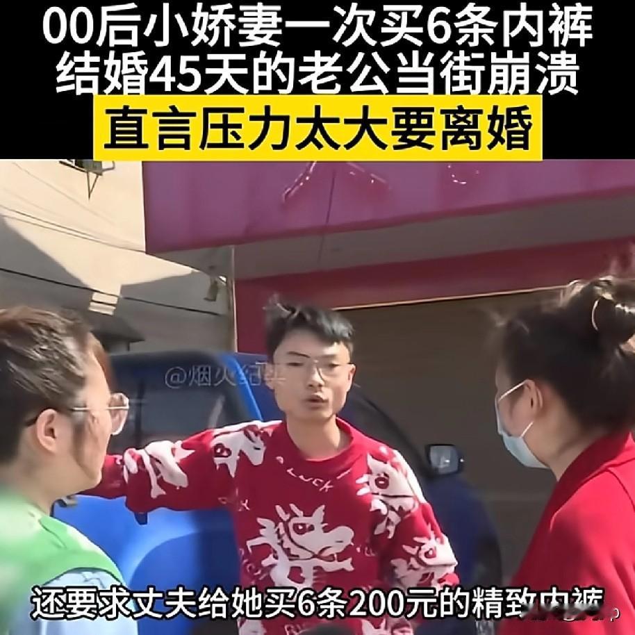00后小娇妻一次买六条内裤 其老公很崩溃,劝她少买一点 毕竟200一条太贵了,没想到被媳妇给了他一巴掌,男子生气了要离婚 俩人是通过婚姻介绍所认识的 男的说对女方一见钟情,俩人都有好感,男方还答应给女方20多万的彩礼,一个多月后就结婚了 可是结婚后彩礼钱一直没没有到位,女方就一直催着丈夫跟他父母要,但她婆婆说先给10万,因为家庭条件不允许,女方说不行,得一次性给完,于是就因为这个小两口经常吵架,因为不愿意离婚,所以女子找来调解员说出了原因 当调解员问男方怎么回事的时候,男的说没有跟她结婚的时候,已经为了她花了差不多6万,而且她总是花钱大手大脚的,还经常跟他母亲吵架 最后在调解员的调解下,双方都同意再给对方一次机会,大家怎么看呢
