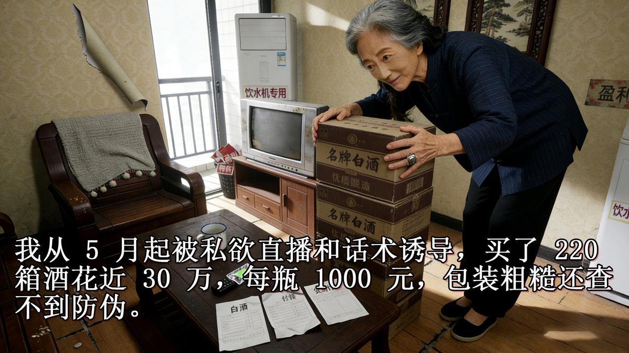 上海 77 岁杨阿婆从今年 5 月开始,受网络私欲直播和销售人员反复诱导,花费近 30 万购买 220 箱所谓名牌白酒,每瓶 1000 元。这些酒包装粗糙、无防伪,还假称世博会专用,实际价仅市场价 1/5。销售人员承诺介绍销售渠道并暗示盈利,却未兑现。杨阿婆用养老钱购买,货到付款无凭证,发货地址假,维权难,老伴脑梗住院 4000 元费用都凑不出。