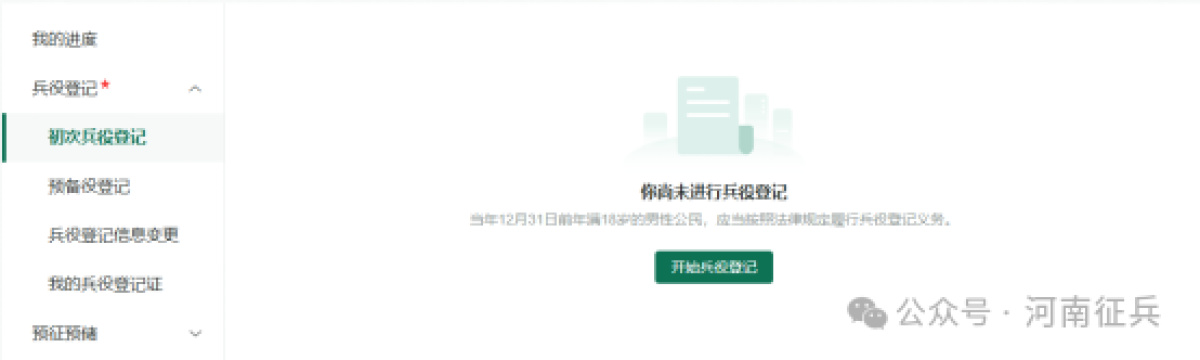登录系统以后,点击右侧的“开始兵役登记”进行兵役登记。