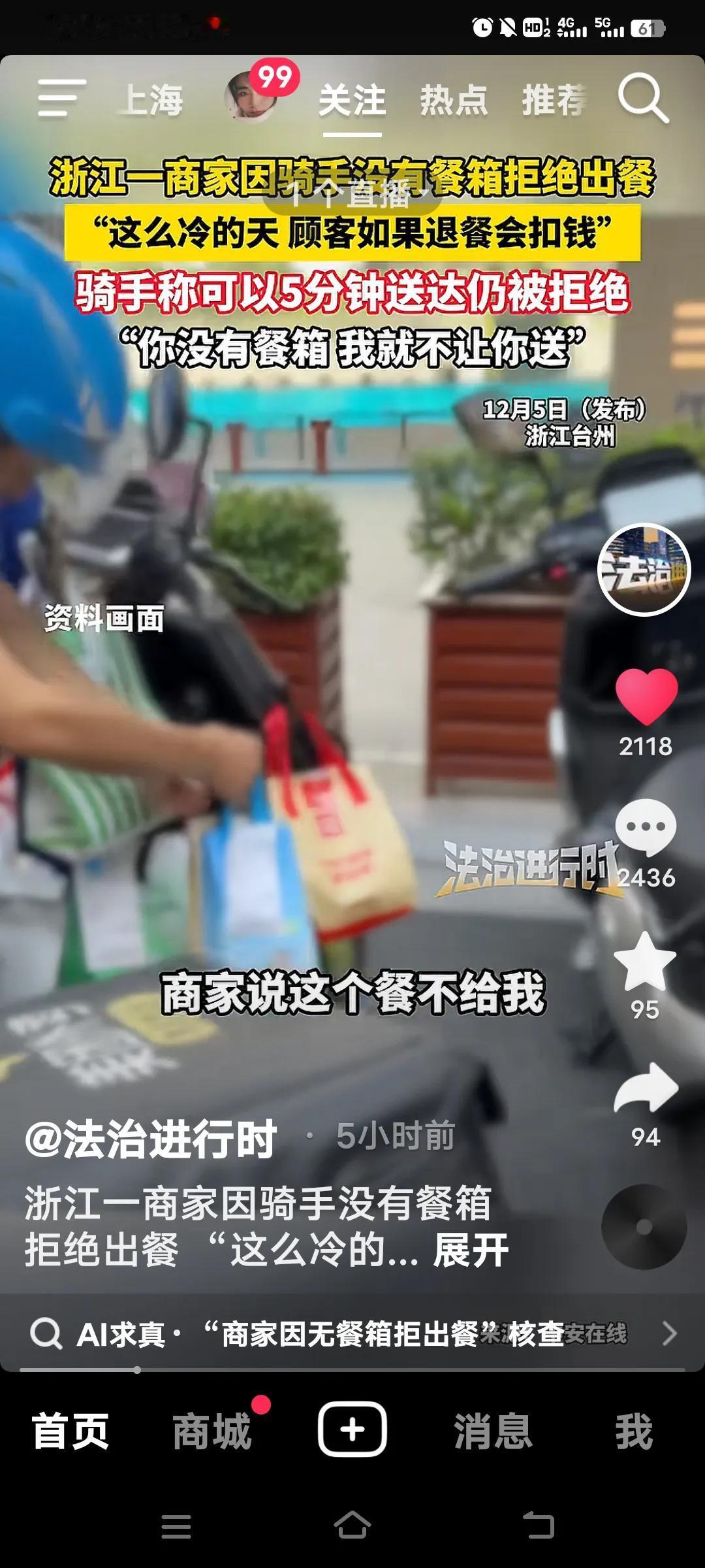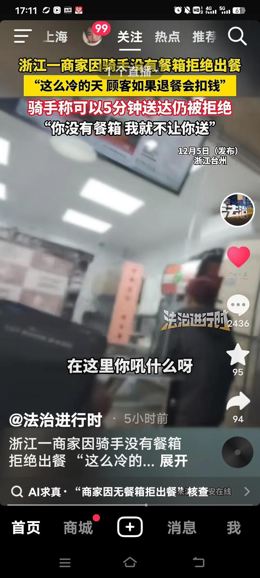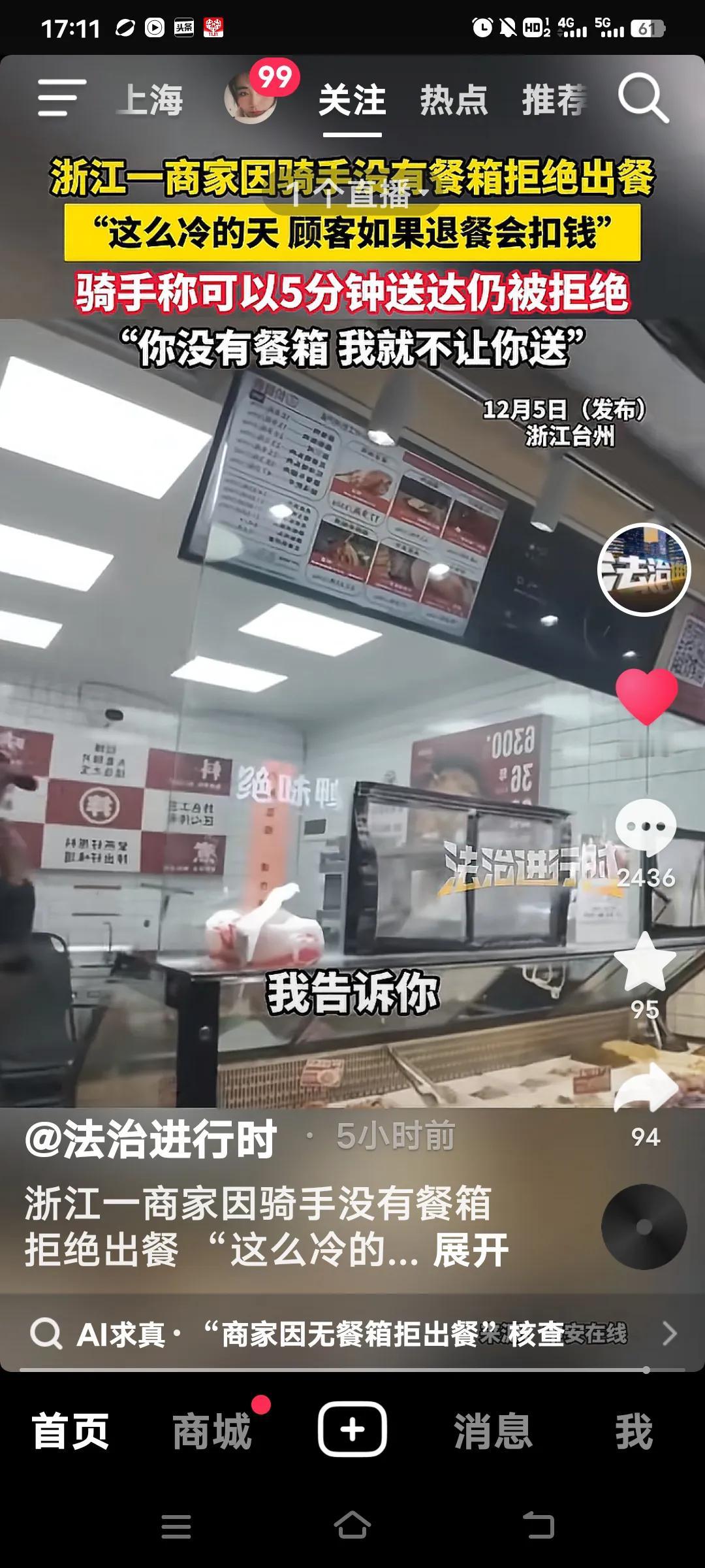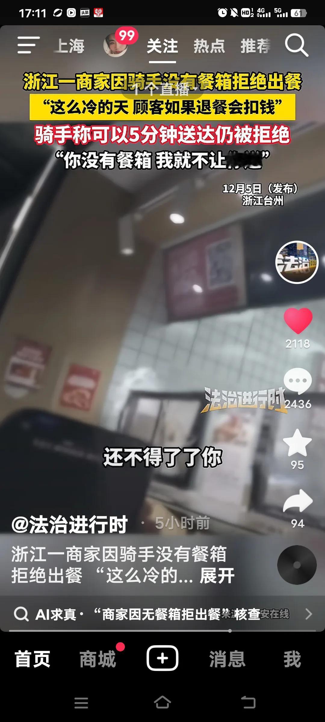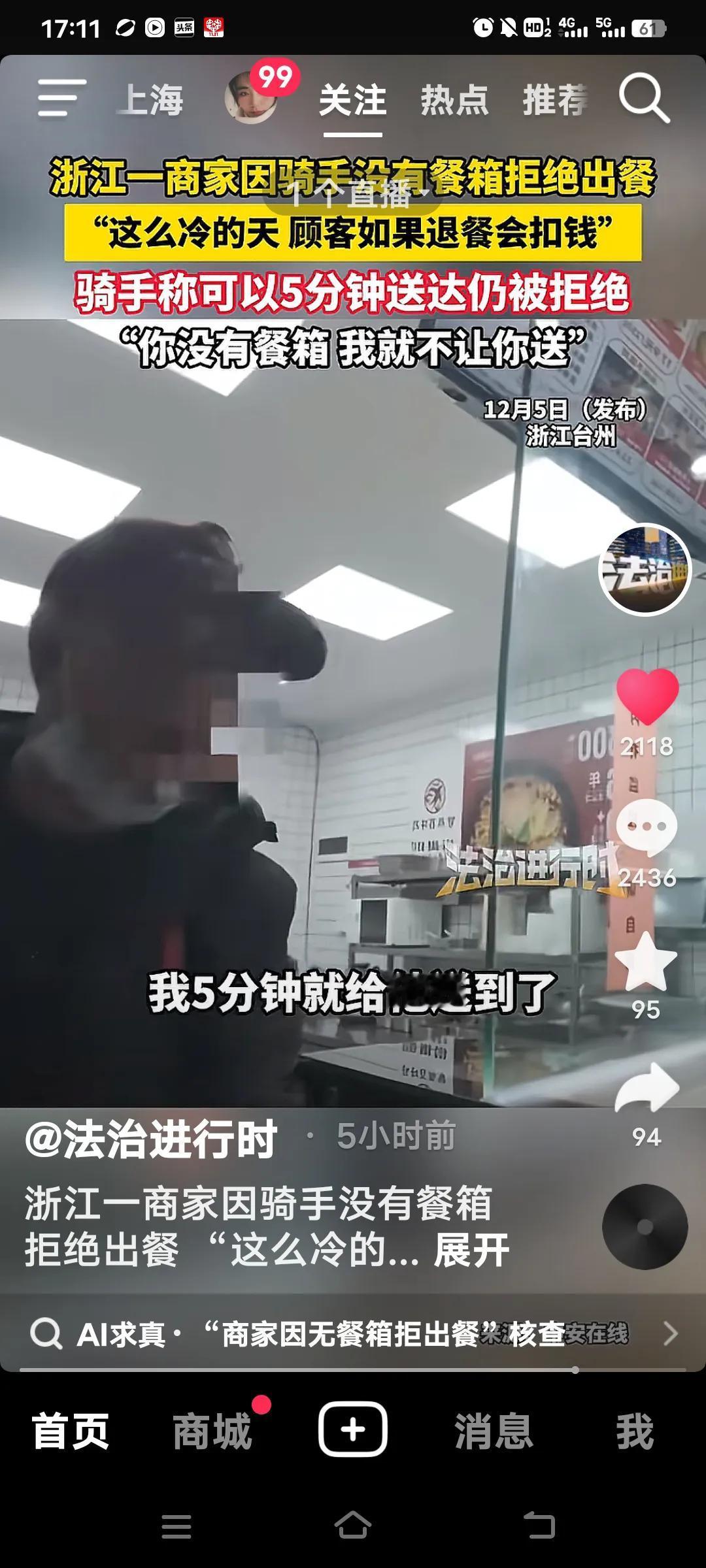 12月4日折江台州,一名骑手没有餐箱就去取餐,店家说什么都不给做。骑手认为有没有