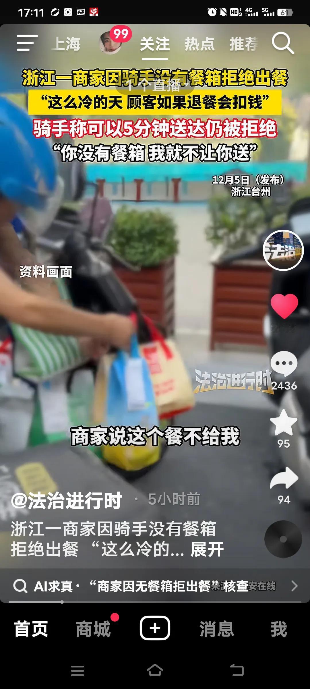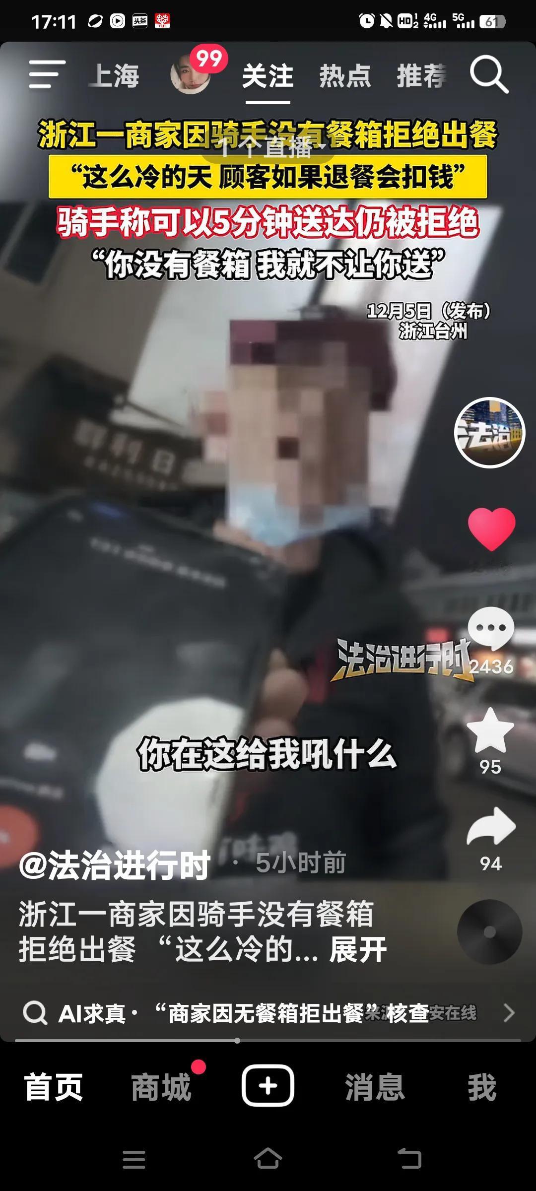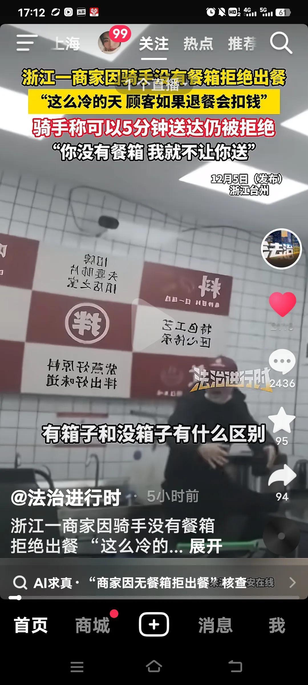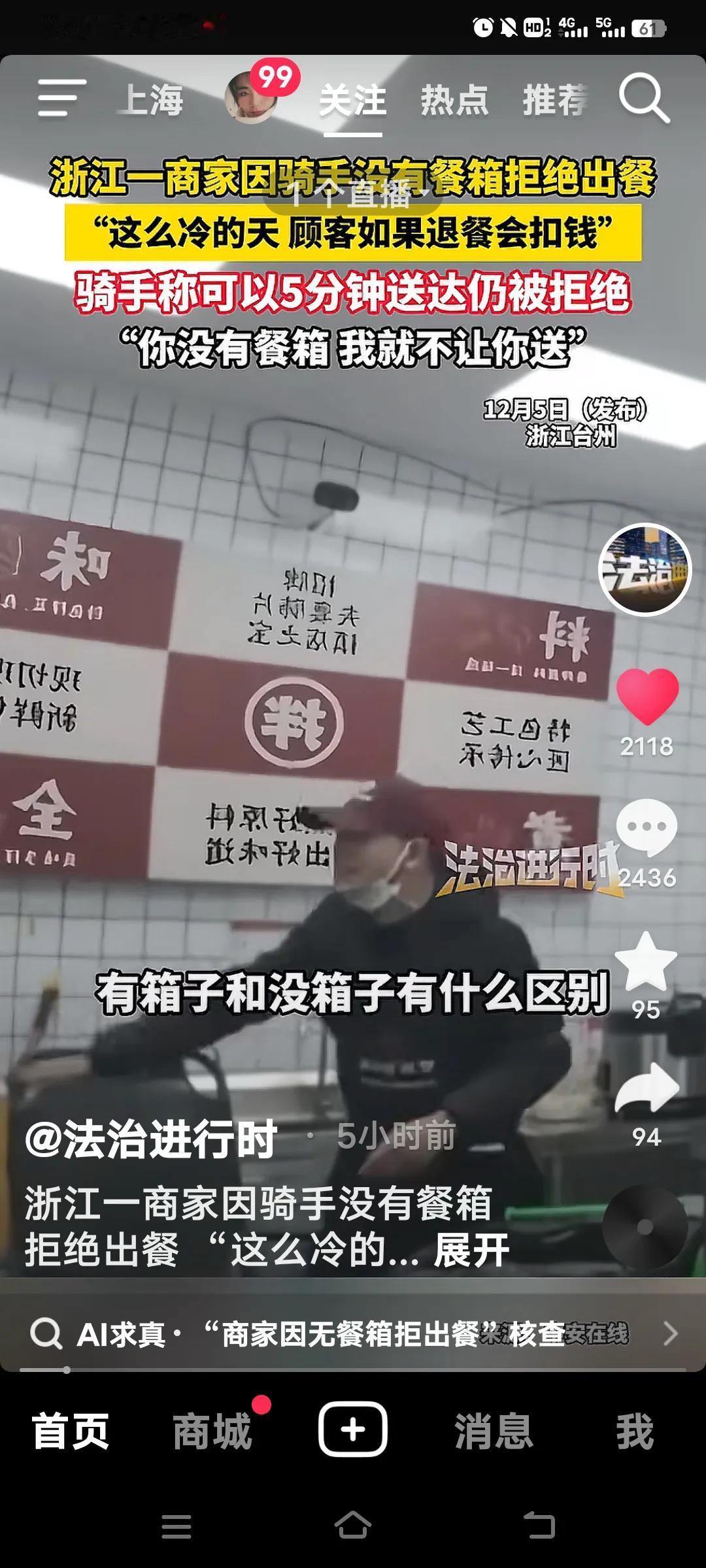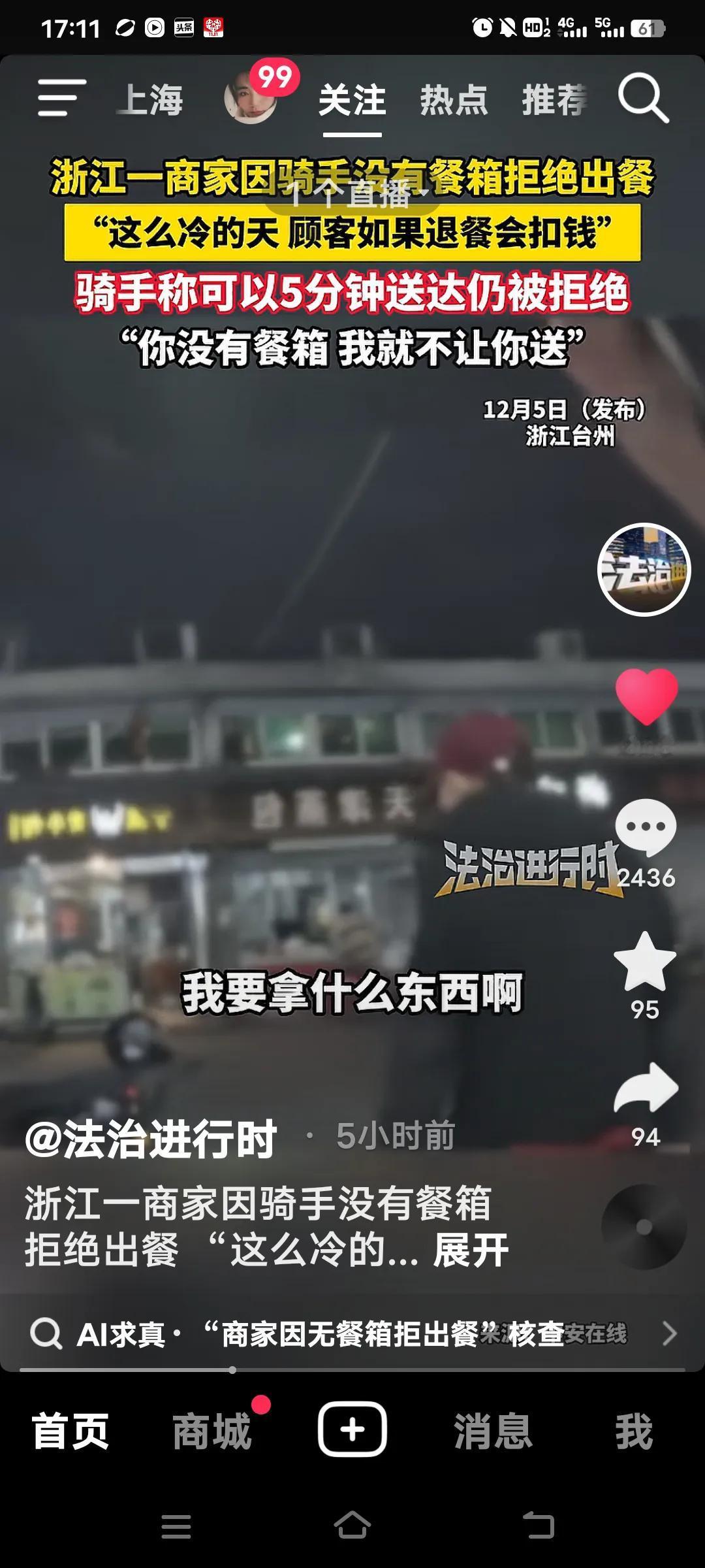 12月4日折江台州,一名骑手没有餐箱就去取餐,店家说什么都不给做。骑手认为有没有