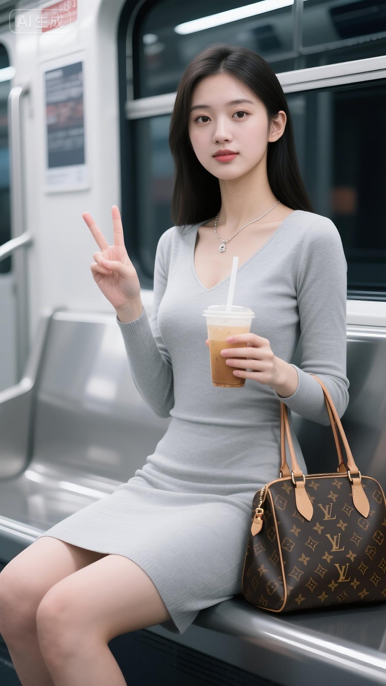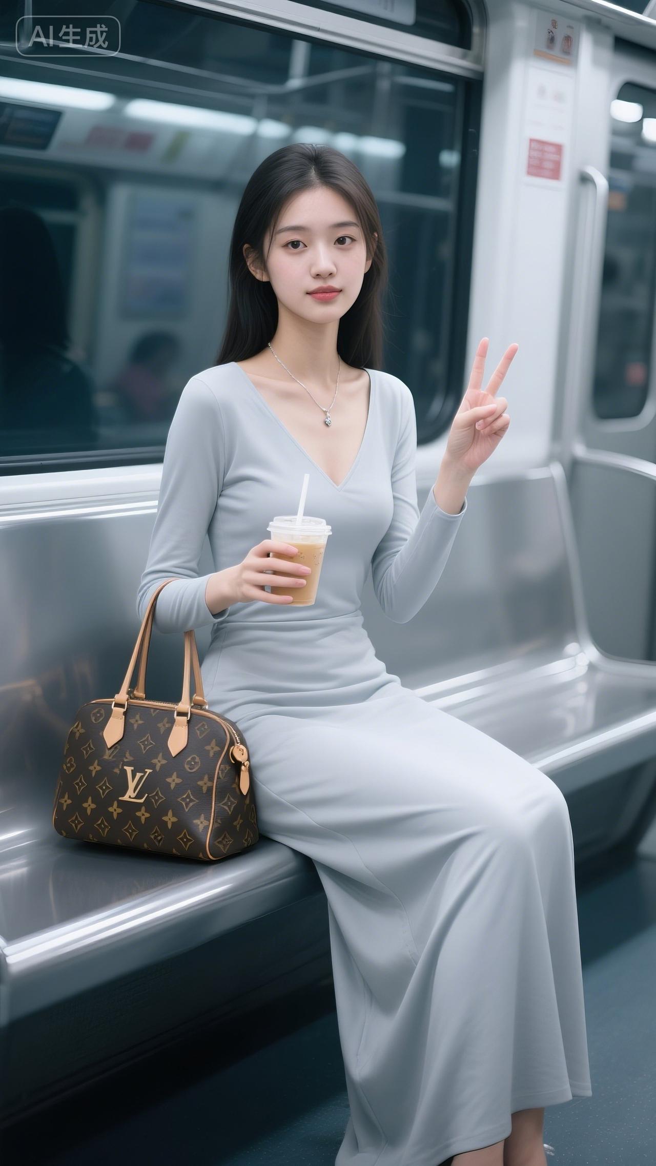 地铁少女,浅灰色V领长裙自带温柔滤镜,修身版型衬得气质又松弛,搭配简约项链和经典