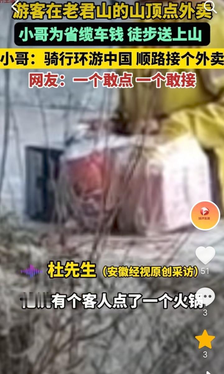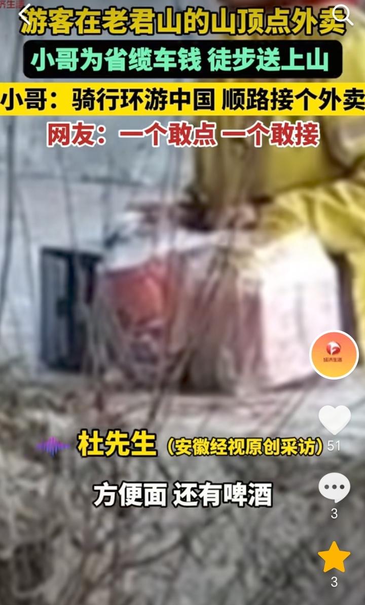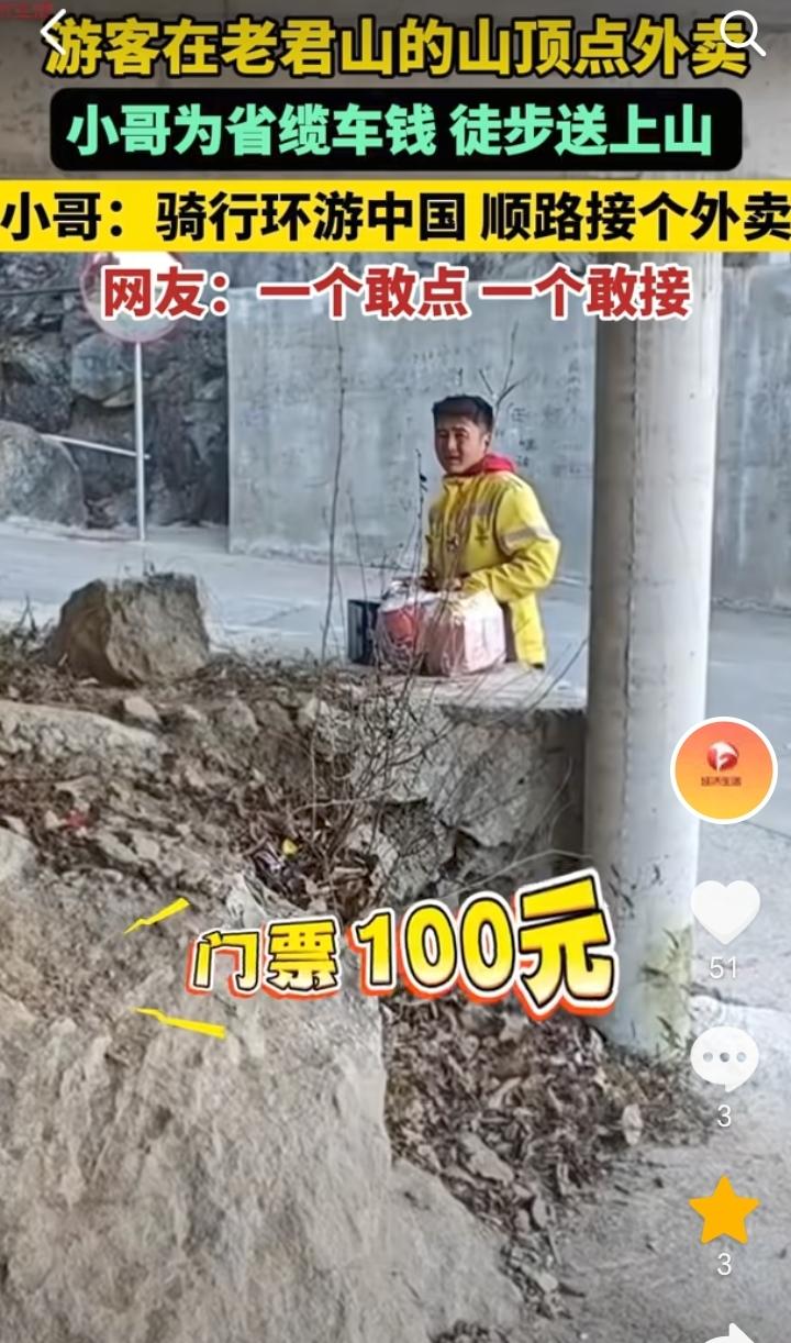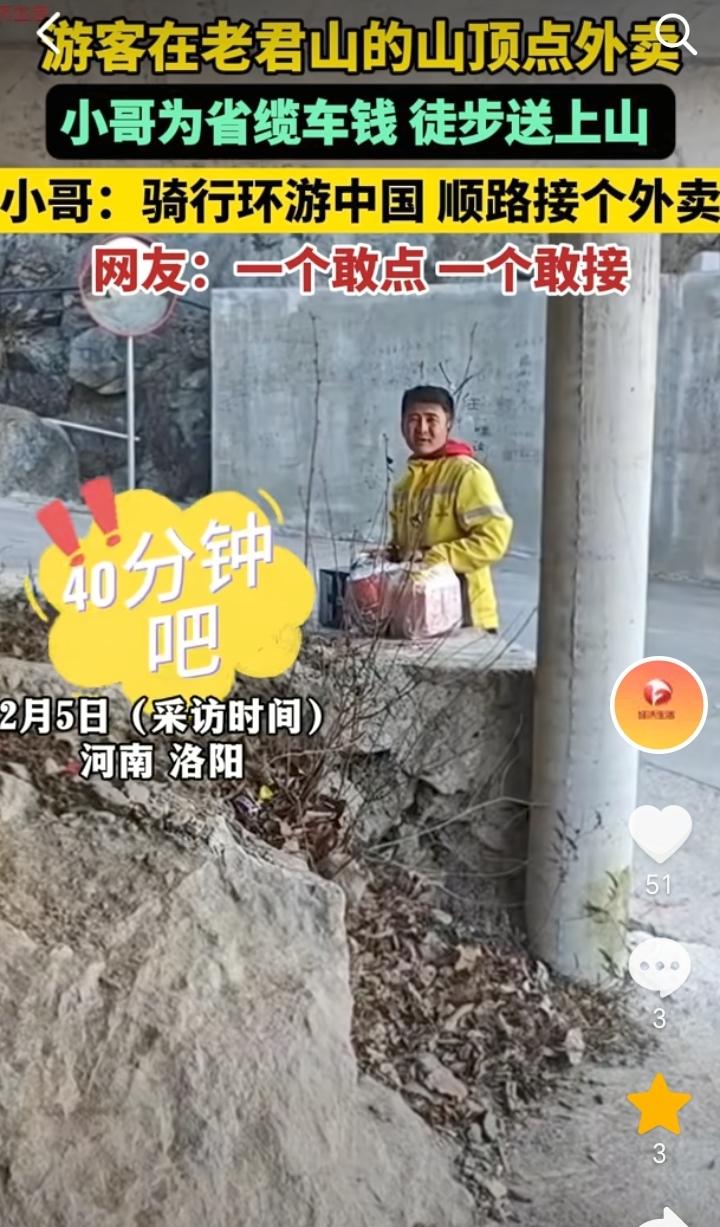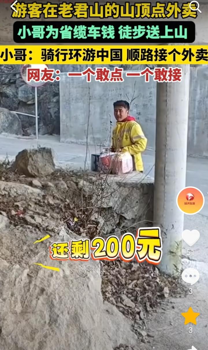 “一个敢点,一个敢接”!河南洛阳,一外卖小哥骑行环游中国顺路接了一个300元的外卖订单,该订单是一个游客在老君山的山顶点的火锅方便面和啤酒,外卖小哥为了省缆车钱,徒步40分钟爬上去,这个订单300元除过门票100元还剩下200元。 一个敢点一个敢接,这位游客也是会享受,直接在老君山山顶点外卖,不过在老君山山顶吃火锅喝啤酒可能也是别有一番滋味。 只要钱到位不管在哪里点外卖,可能都会有外卖小哥接单,为了碎银几两外卖小哥也是没有办法。 赚钱没有不辛苦的,想赚钱就要不怕苦,不怕累,趁着年轻努力奋斗。