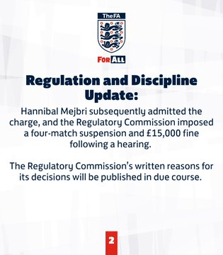 汉尼拔随后承认了指控。独立监管委员会经听证会审议,对其做出停赛4场、罚款1.5万英镑的处罚。