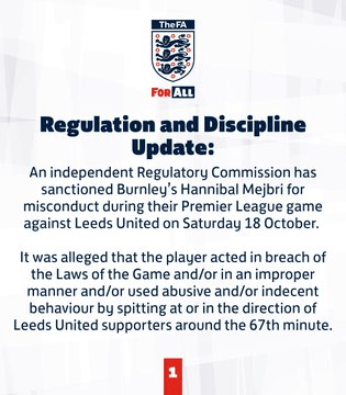 独立监管委员会已对伯恩利球员汉尼拔-梅杰里做出处罚,事由是他在10月18日对阵利兹联的英超比赛中的行为。汉尼拔在这场比赛第67分钟左右向利兹联球迷方向吐口水,此行为被指控违反了比赛规则,构成不当举止和/或侮辱性、不当行为。