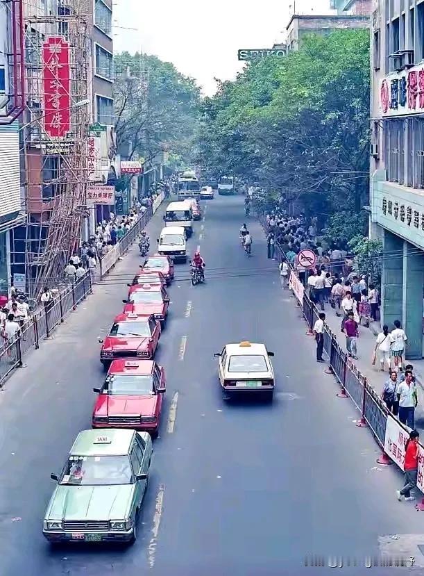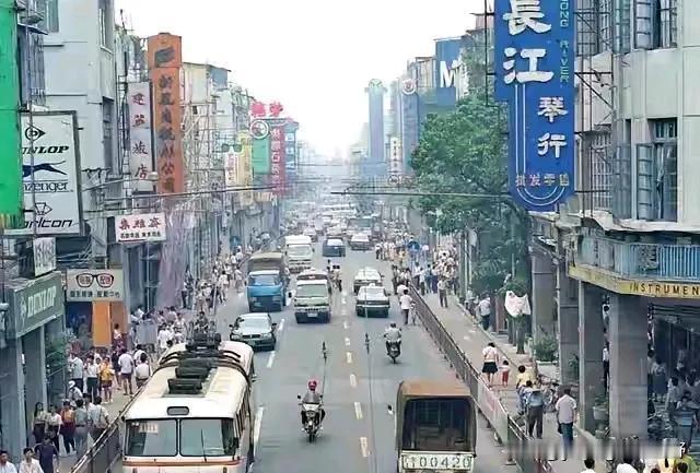 80年代末,90年代初的老广州。照片的拍摄地点对于生活在广州的人们来说应该不陌生,应该就是中山五路或北京路商圈一带。那时的中山路上已经挂满了招牌,商业气息浓厚,街道上也有不少行人与机动车辆,凸显出了广州这座城市繁华的商业底蕴。