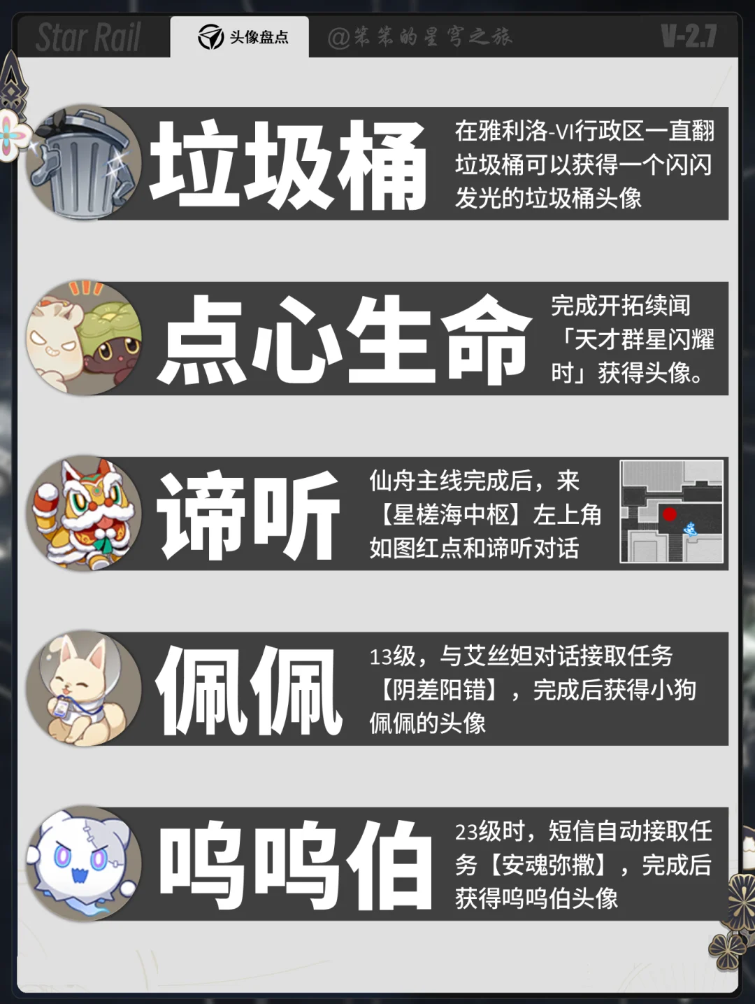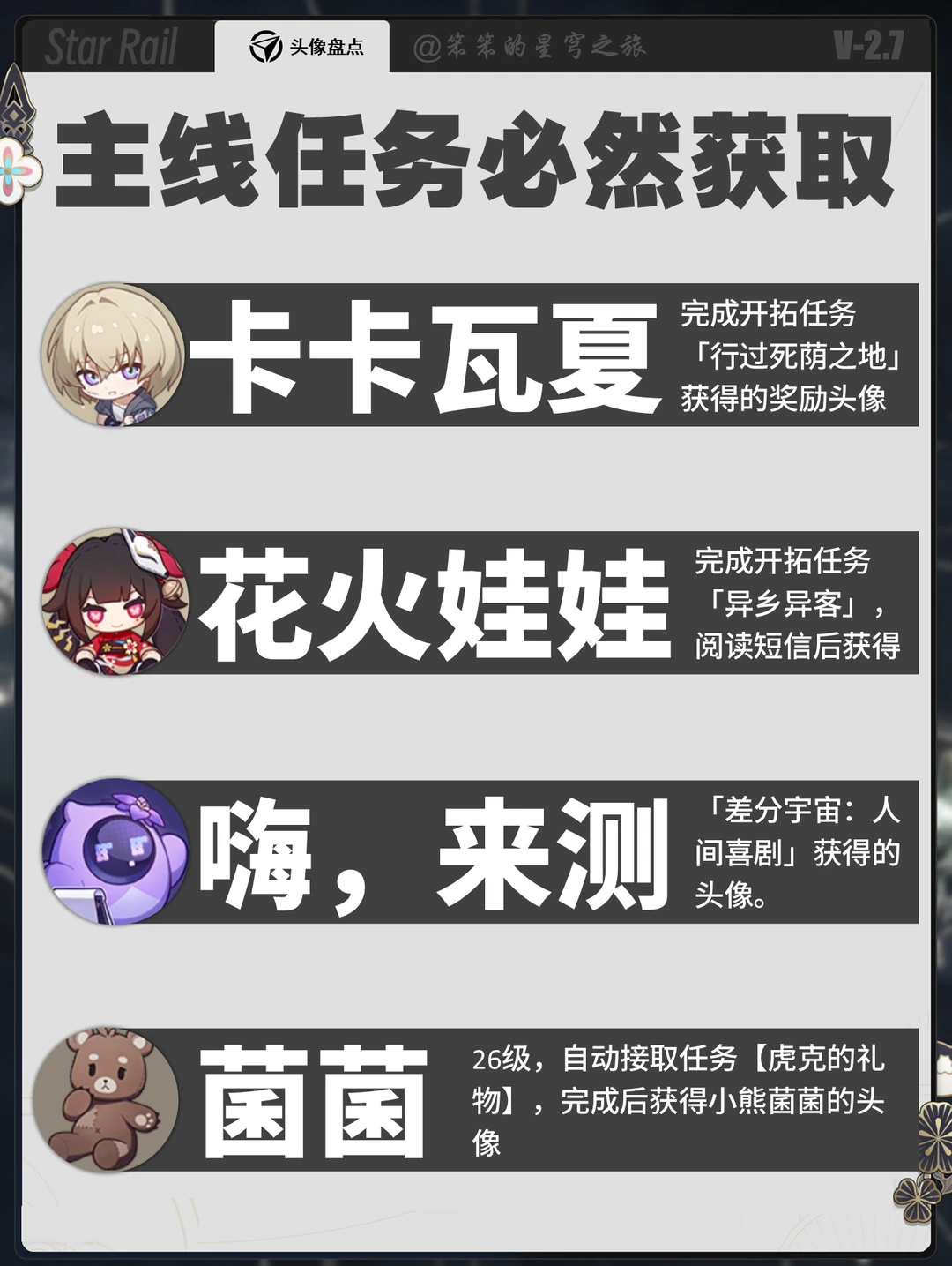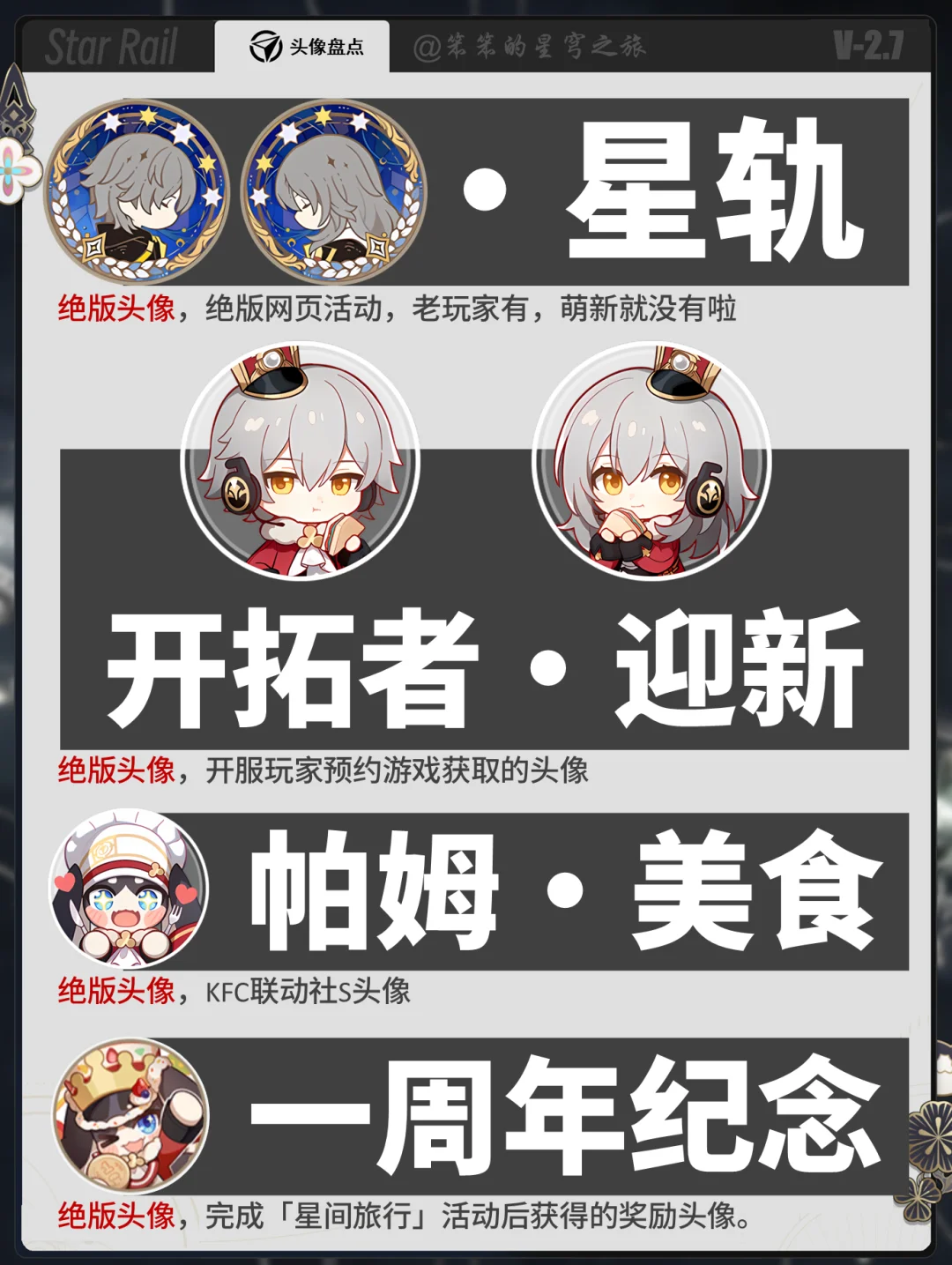 🐱大家好,我是笨笨 今天给大家带来的是 截止2.7版本崩铁所有特殊头像获取的攻略 最后的几个头像已经绝版 前面的头像都是可以获取的 还没获取的开拓者赶紧冲啊