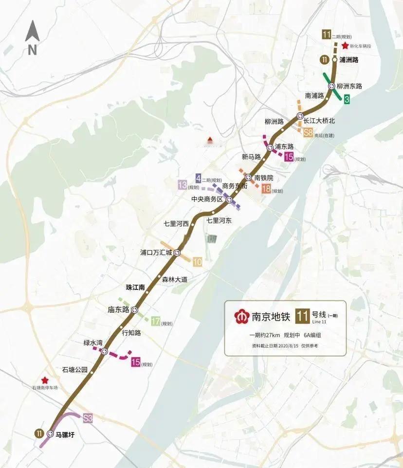 南京地铁11号线一期是江北新区的首条全自动运行线路,一期工程全长26.7千米,设20座车站(含19座地下站、1座高架站),采用6节编组A型列车,设计时速80千米,预计2026年建成通车。 线路北起浦洲路站,经江北新区核心区向南贯穿三桥片区、桥林新城,终至马骡圩站,远期规划二期工程将向北延伸至葛塘站,共设9座换乘站,可与3号线、10号线等多条线路换乘。它被誉为江北的“换乘王”,未来可与10条地铁线路在9座车站换乘。 目前,18座车站已开工,其中17座完成主体结构;32条盾构隧道已始发,30条贯通。线路贯穿桥林制造板块、研创园、中央商务区等重要区域,将极大缓解江北交通压力。 从2021年开工以来进展不断,像2025年1月车辆段出入段线双线贯通,5月江淼路站主体土建工程通过验收,建成后江北的交通会更便利。南京地铁 南京交通地铁站 南京地铁站名 轨道11号线 地铁南京路站