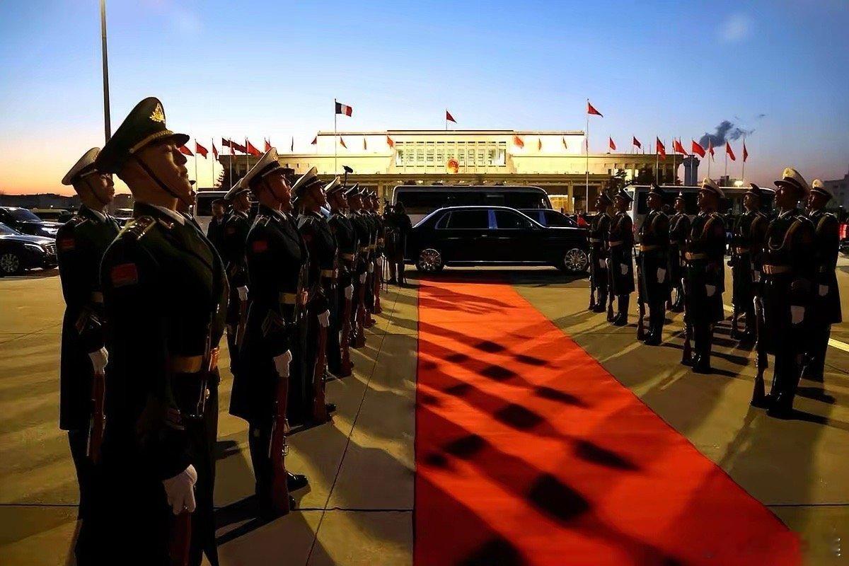 不得不服,法国人那镜头,是真的毒。有些场面,不用说一个字,你就知道分量。傍晚,天都擦黑了,一轮圆月当空,不偏不倚,就挂在专机顶上。人走下舷梯,像是走进了一幅早就为你准备好的画里。这哪是新闻摄影,这简直是电影开场。还有那张红毯。绝了。人还没到,一排士兵的影子,被灯光拉得长长的,齐刷刷先铺了过去。沉默的、坚毅的、带着体温的影子,给后面的贵客开路。这才是真正的排面。无声的,却比任何口号都有力量。最后那张大场面,仪仗队,专机,一览无余。你甚至都找不到主角在哪,但满眼都是主角——那种叫“国力”的主角。是一种不动声色的庄严。高手过招,连空气里都是戏。我们总说要讲好中国故事,你看,最好的故事,有时候根本不用我们自己开口。