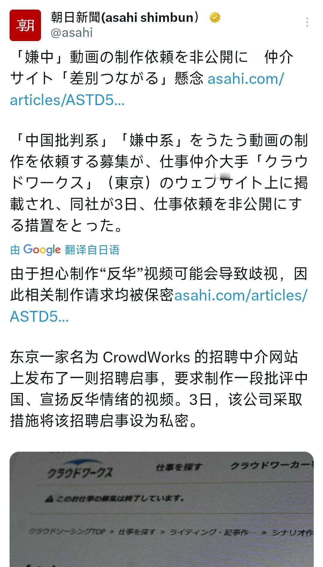12月6号,根据日本《朝日新闻》的报道,揭开了日本反华舆论和宣传背后的那条“生意链”。那么它到底说了一些什么呢? 原来,日本的一家大型招聘平台CrowdWorks上发布了一则招聘信息,招聘相关人员在YouTube视频平台上制作批评中国或宣扬反华情绪的视频。希望能够制作相关主题的脚本,并利用人工智能软件进行图像和视频的编辑。每份剧本的报酬从1500日元到5000日元不等,剪辑费则从2000日元到7000日元不等。在被媒体广泛报道之后,目前这则招聘启事已经被设置为不可见了。 在目前日本整体右倾的社会氛围当中,《朝日新闻》做出这样的报道是很有价值的,也是很不容易的。它有助于帮助我们去理解日本社会当中的那种反华情绪,以及对于中国不理性和不客观的认知,背后很大一部分是流量和资本的利益在运作,甚至是为了利益来去刻意的炒作和抹黑。毕竟这种煽动民粹的视频,在YouTube上是更受欢迎,阅读量更高的。 对于经常往返于中日两国之间,或者相对了解中国的人来说,这种视频的影响力可能并不大。但对于很少出国,或者不太具有国际视野的日本人来说,这一类广撒网的视频就具有极强的影响力和蛊惑力了。它们成本低廉,覆盖面广,且极具煽动力,说对推升中日之间的紧张局势升级,起到了极坏的作用。