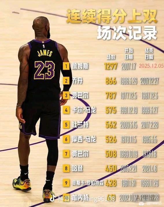 昨天詹姆斯的连续上双记录被断,很多人还不知道其中意义,给大家看一下! 其实詹姆斯的10+得分,比昨天湖人的胜利更重要。 因为1297场还能延续,永远也不会有人接近。 结果老詹太无私了,没有自己单打,选择无私传球,放弃历史记录居然还被骂....[可怜]
