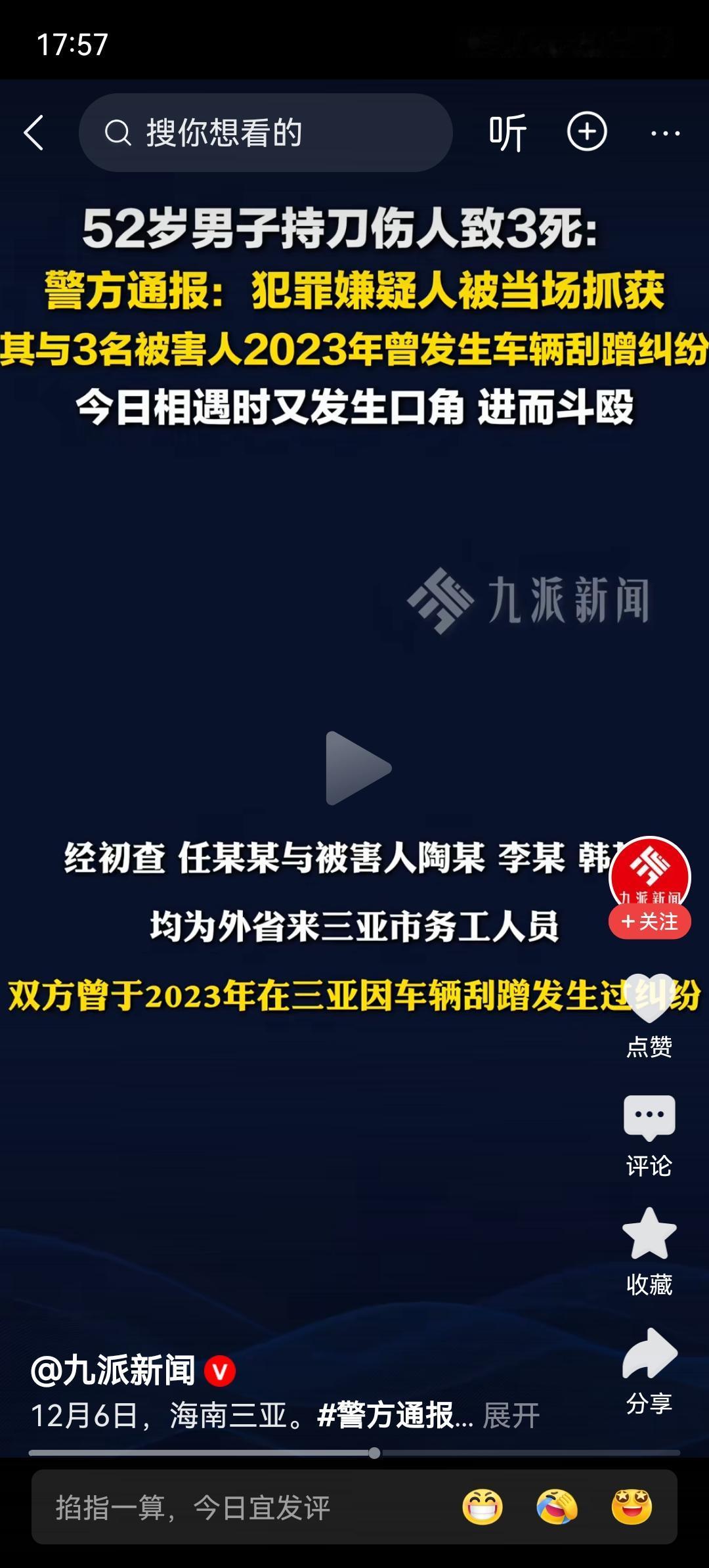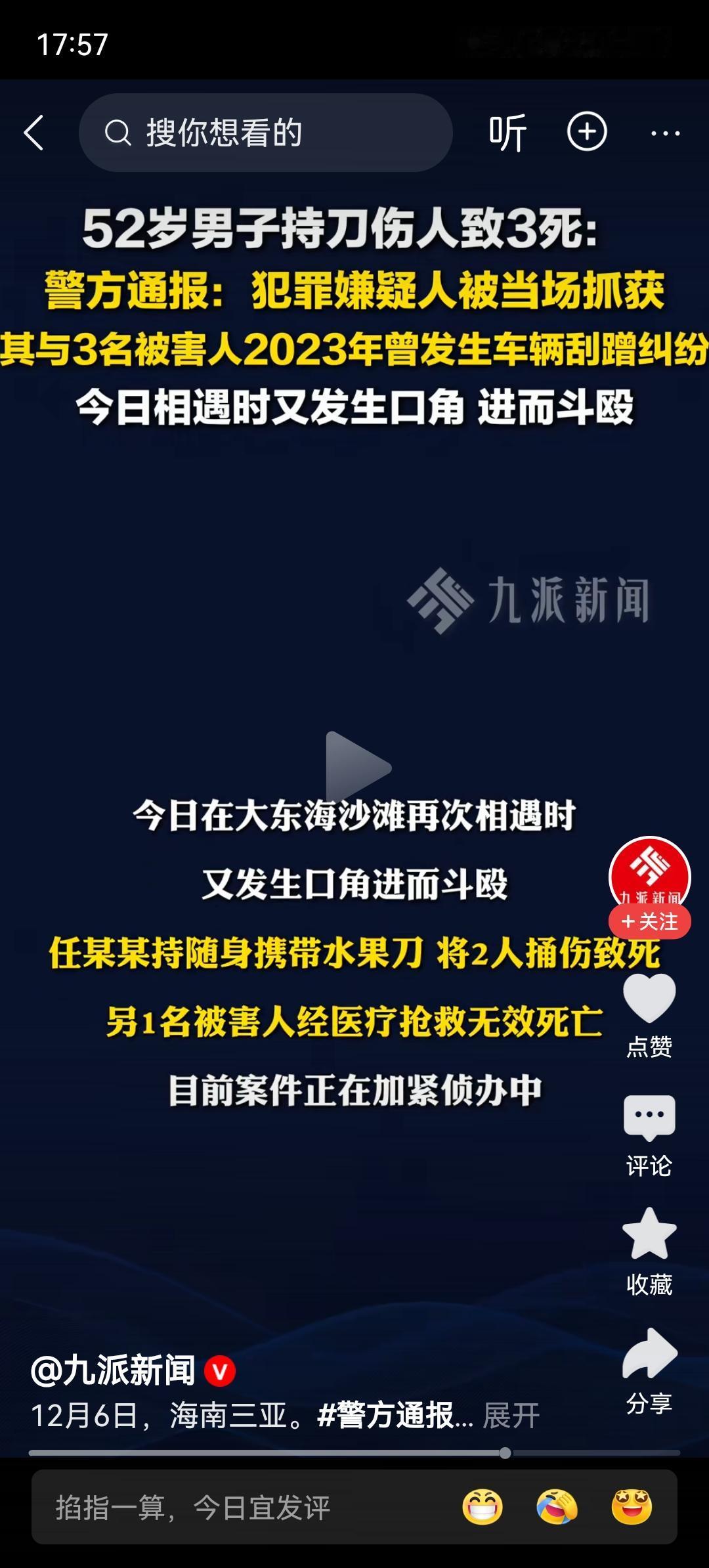 一挑三,全灭!三条性命没了! 都52岁的人了,还有啥看不开的。 怎么火气就这么大呢? 12月6日,三亚发生了一起刑事案件。一名52岁的男子与另外三人发生口角,随即用随身携带的水果刀猛捅三人,导致两人当场死亡,一人送医院抢救无效后死亡。 又是一出悲剧。据有的目击者称,三人中的其中一人逃跑的过程中,凶手紧追不舍,追了五十米后又将人捅倒在地。 这是有什么深仇大恨?据警方公布的信息,行凶者早在2023年就与这三人因为车辆剐蹭发生过纠纷。 这次在海滩再次相遇,又产生了口角,于是就发生了悲剧。 具体的情况不得而知,但是双方肯定对2023年的事故都还耿耿于怀,否则也不会再次争吵。 出门在外,还是要冷静一点,不能让冲动占了上风。做任何事之前都想想家人,不要图一时之快,让家人承受无尽的痛苦。