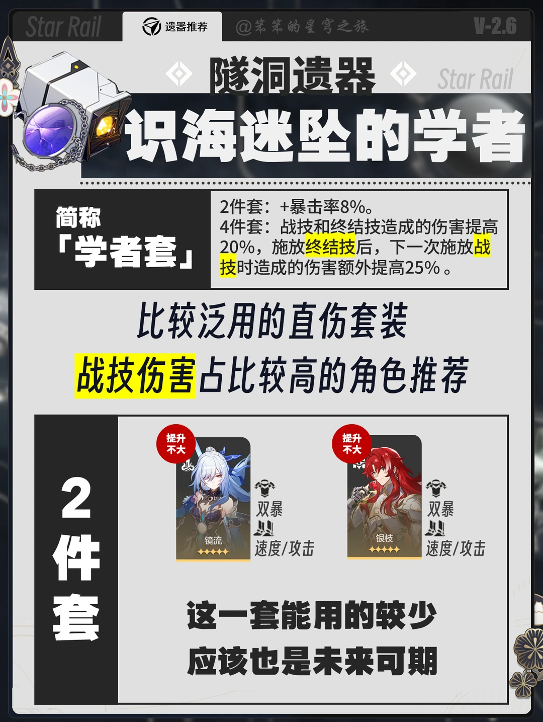 🐱大家好,我是笨笨的铲屎官 2.6新上线了两套外圈遗器 目前没有合适的角色 从机制来看,应该是为未来角色准备的 苦旅套应该是辅助套装 外观是星期日的服饰 应该就是星期日的专属套装 学者套目前也没有合适的套装 也是未来可期
