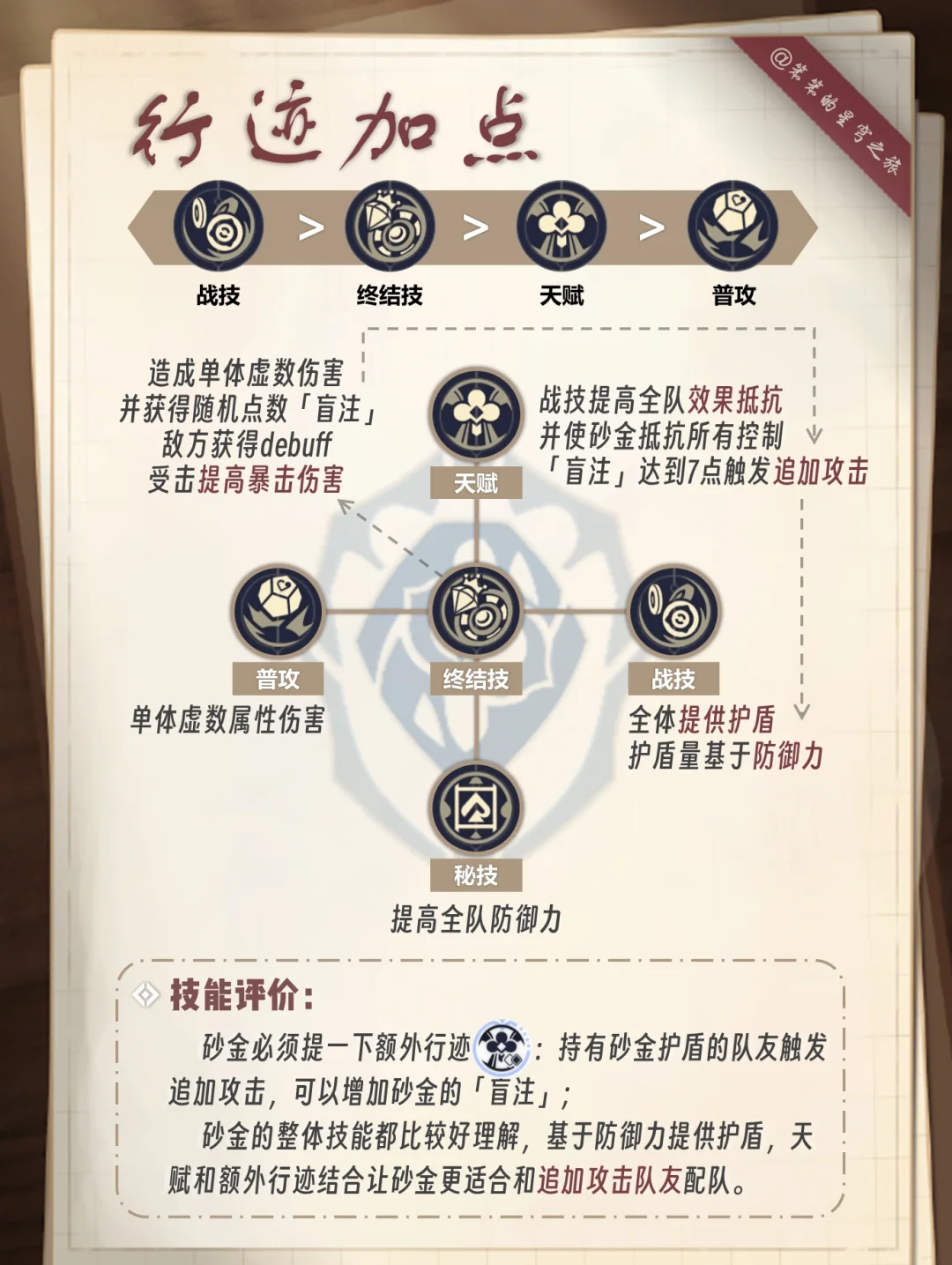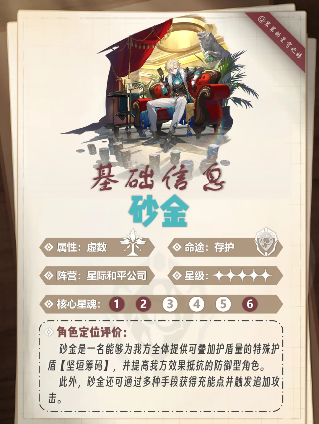 🐱大家好,我是笨笨的铲屎官 今天给大家带来的是砂金的培养攻略 明天砂金就上线了,多少开拓者打算抽砂金啊 砂金是不折不扣的目前最强护盾角色 同时还非常匹配追加攻击队友 如果培养了真理、托帕都非常推荐抽取哦 因为砂金还可以添加负面效果 所以黄泉队目前也非常适合砂金入队