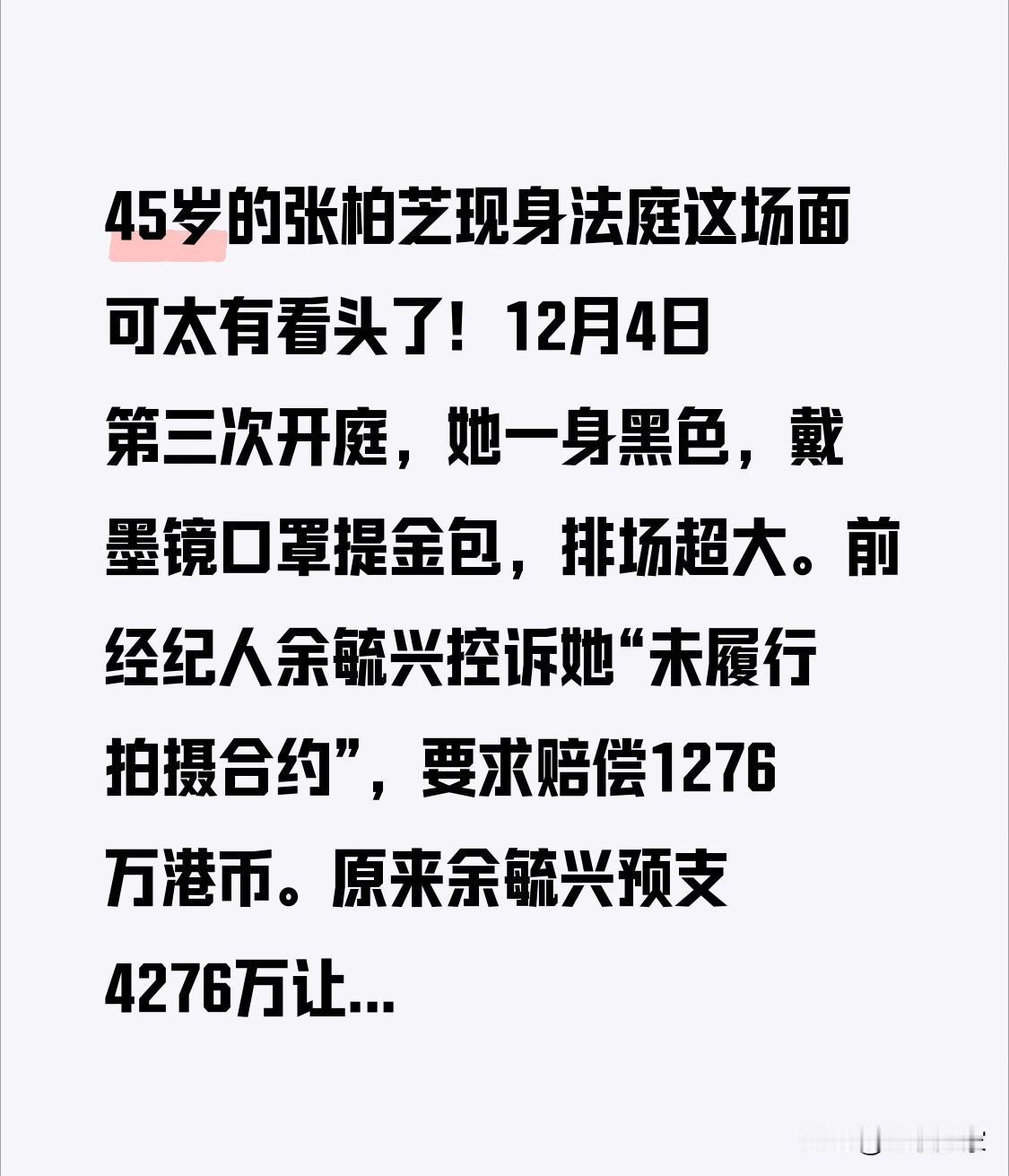 45岁的张柏芝现身法庭这场面可太有看头了!12月4日第三次开庭,她一身黑色,戴墨镜口罩提金包,排场超大。前经纪人余毓兴控诉她“未履行拍摄合约”,要求赔偿1276万港币。原来余毓兴预支4276万让她拍6部电影,结果她没履行合约还辞退了对方。 法庭上更是状况不断,录音里余毓兴平静说做了假文件,他解释是情绪话,但谁信啊。双方各执一词,余毓兴说和她父亲是朋友,她律师却否认。这案子到底咋判,真让人好奇。大家觉得张柏芝会胜诉吗?这娱乐圈的官司还会有啥反转?这1276万港币最终会花落谁家? 谢霆锋,张柏芝 张柏芝 张柏芝带娃争议 张柏芝舞台造型 张柏芝带娃美学 谢霆锋,张柏芝 张柏芝 张柏芝带娃争议 ​​张柏芝 张柏芝舞台造型 张柏芝带娃美学 张柏芝穿搭