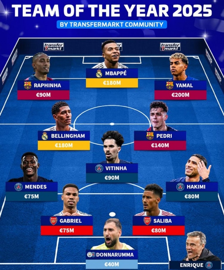 直播吧12月7日讯《转会市场》用户投票选出了本年度最佳阵容,欧冠冠军巴黎4将在列。