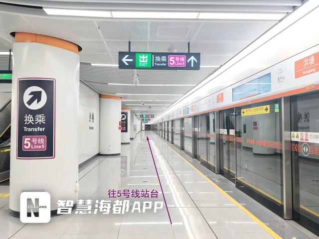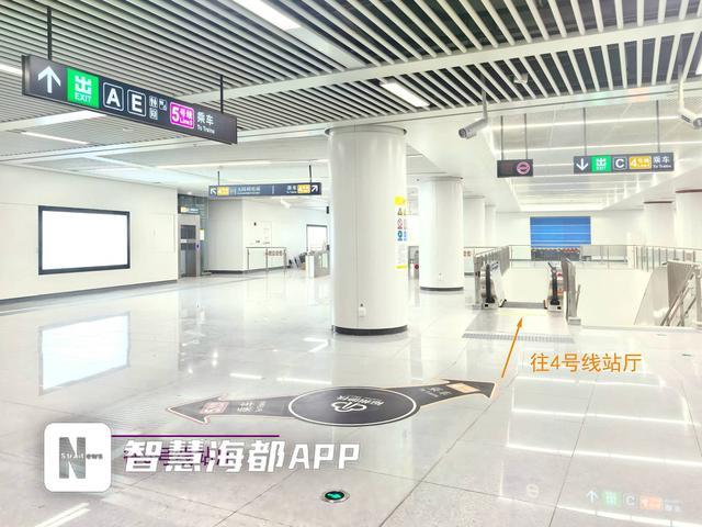若市民在4号线站厅进站,可根据现场导向标识指引穿过4号线站厅到达5号线站厅,再通过5号线站厅内的电扶梯或无障碍电梯下行至5号线站台乘车。