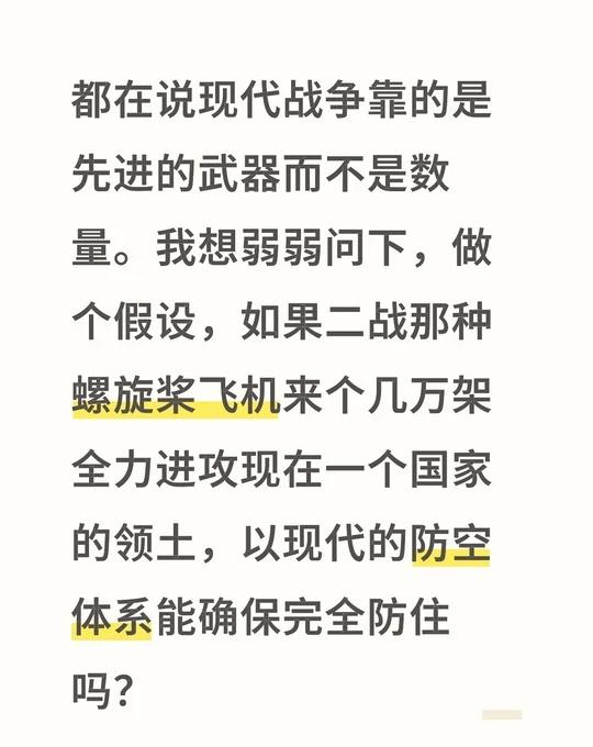 都在说现代战争靠的是先进的武器而不是数量。我想弱弱问下,做个假设,如果二战那种螺旋桨飞机来个几万架全力进攻现在一个国家的领土,以现代的防空体系能确保完全防住吗?