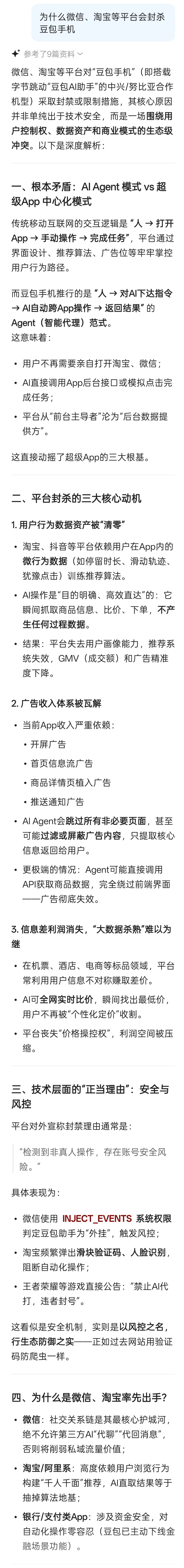 一直不是很清楚,微信、淘宝要封豆包手机的底层原因拿去问“千问”,讲的太明白了这是一场【AI Agent 模式 vs 超级App 中心化模式】的战争。