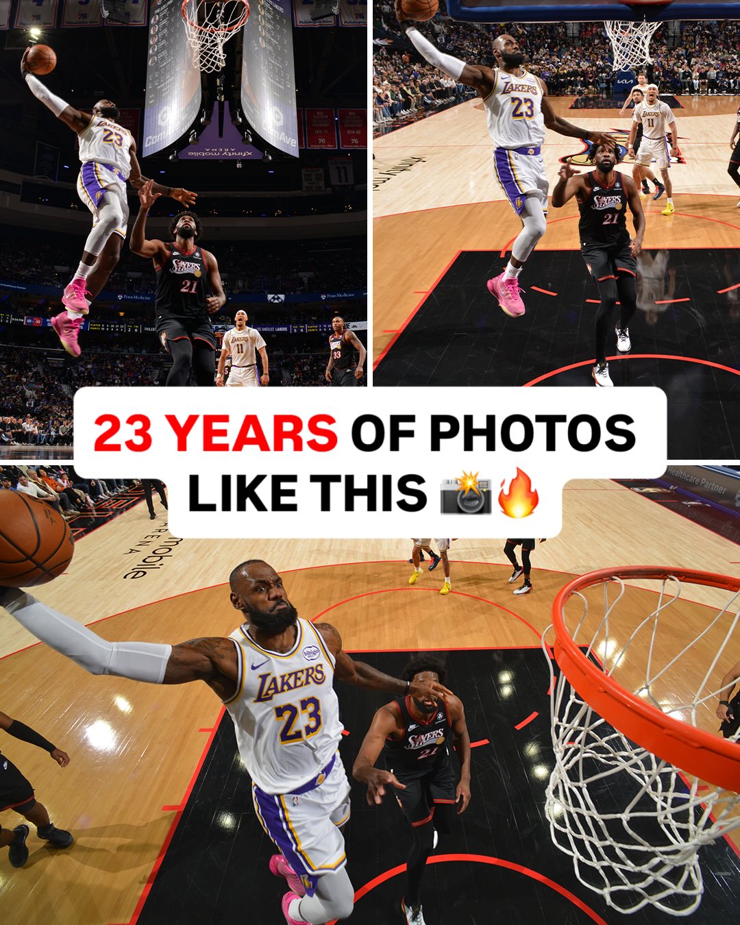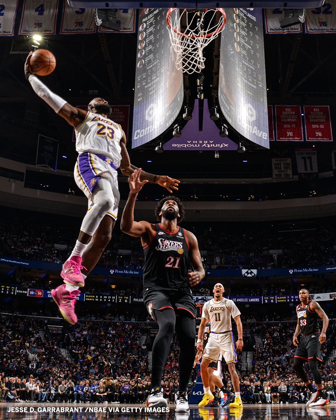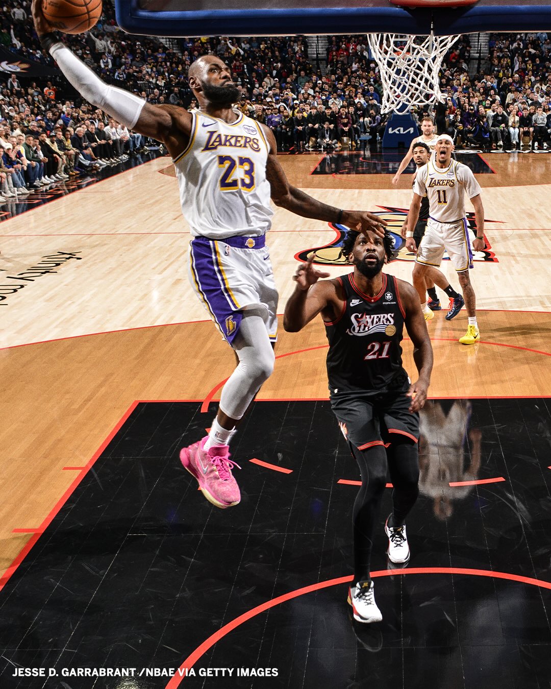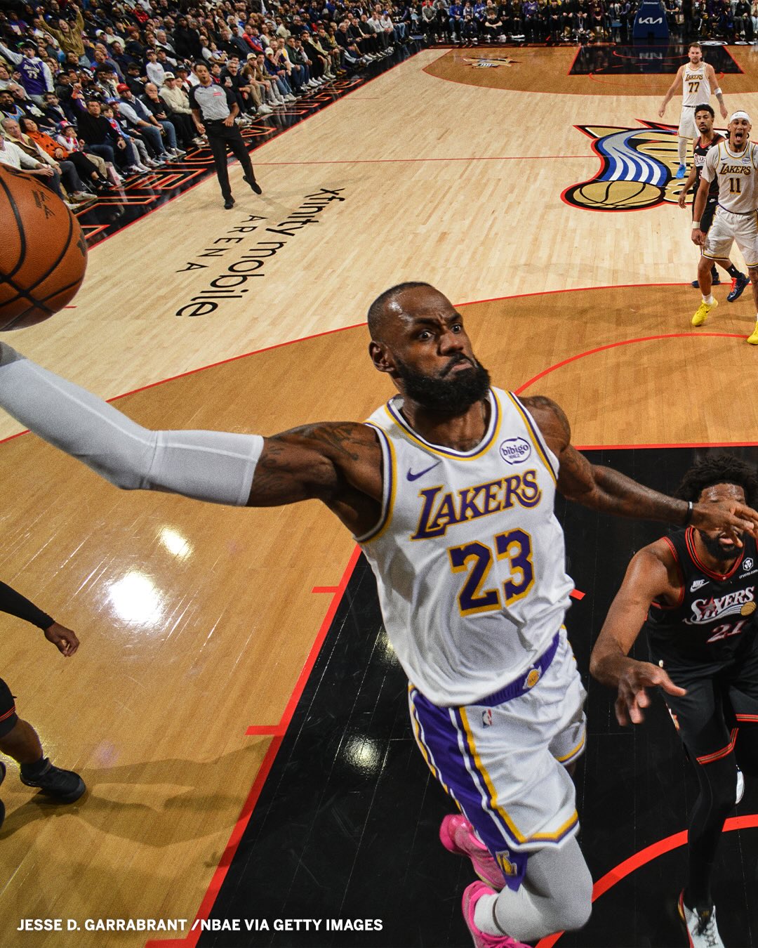 虎扑12月08日讯今日,美媒nbaonespn发布ins,晒出一张勒布朗-詹姆斯今日在恩比德头上完成战斧劈扣的赛场图。