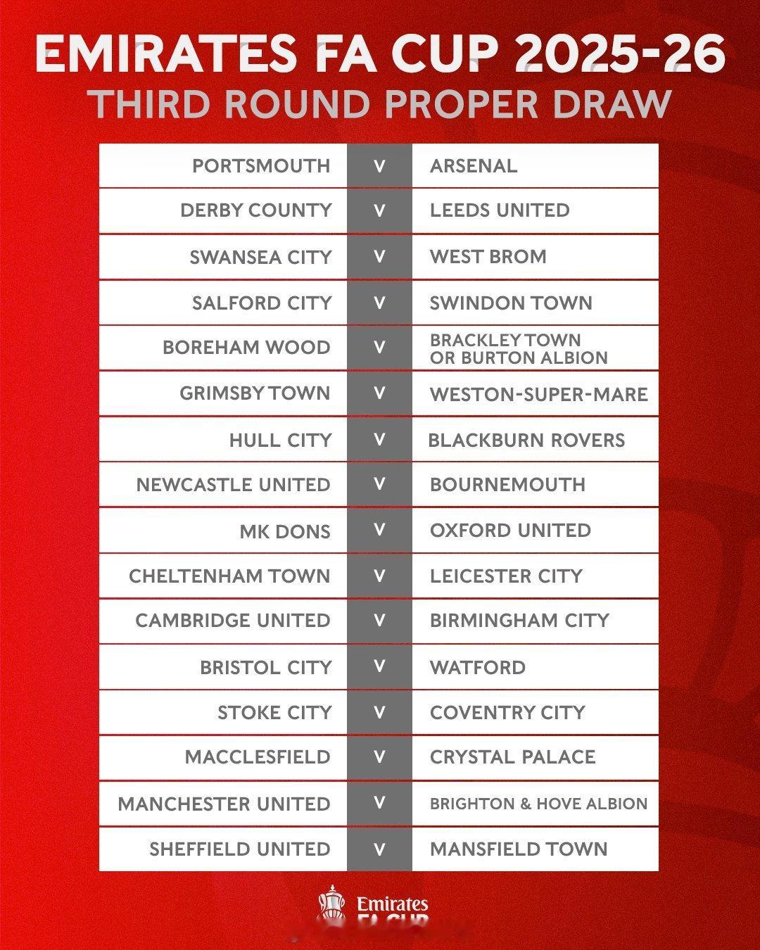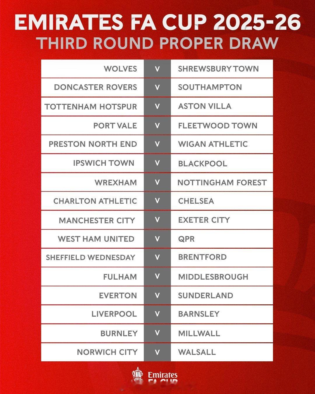 足总杯第3轮抽签结果出炉,以下为涉及BIG6的对阵:热刺VS维拉查尔顿VS切尔西