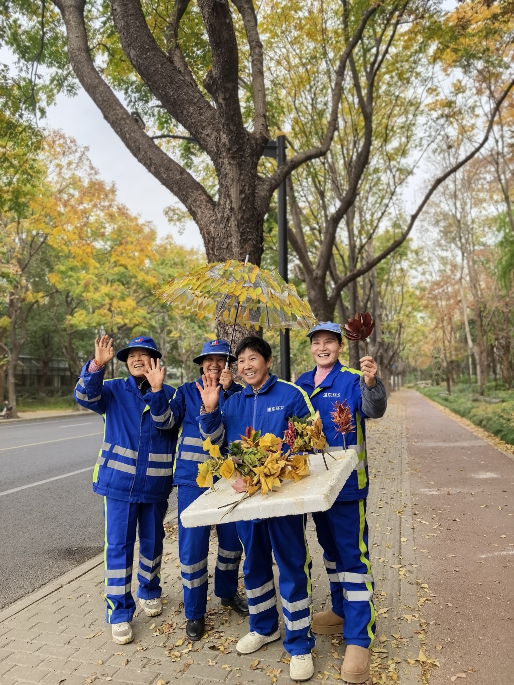 科苑路以栾树为特色,当前正值最佳观赏期。在社交平台上,落叶玫瑰、落叶雨伞装饰、落叶风铃等,在环卫工人的巧手下栩栩如生。