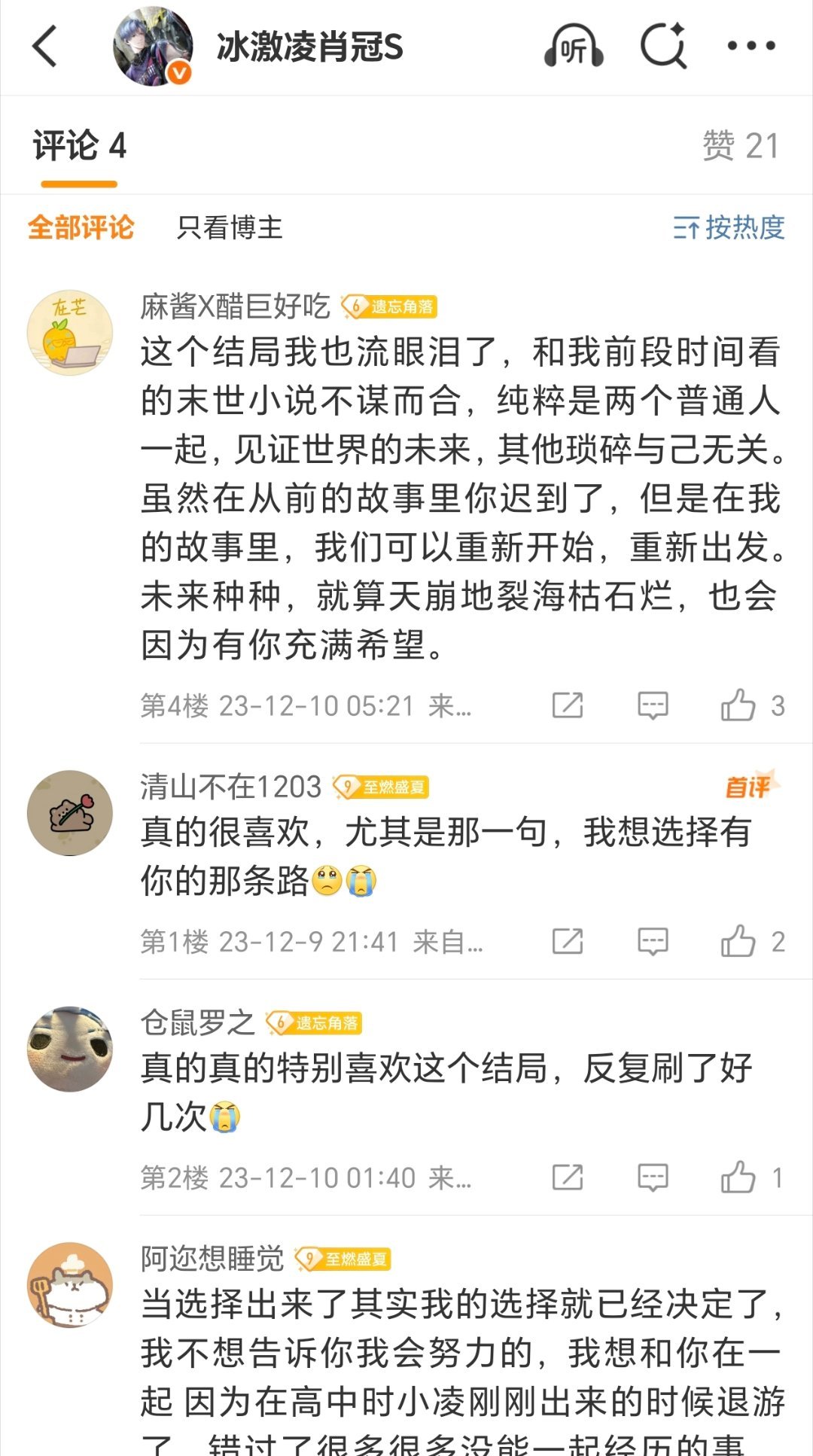 打开那年今日翻到了两年前的微博,那天中午窝在被子里过主线剧情过着过着就开始哭,当时想着如果主线能够停在这里也不错,就当这是我们的结局好了,去翻了翻评论的零几主页,基本到现在都依然喜欢着凌肖,爱真是神奇的东西,一边流泪一边还想要陪在你的身边。