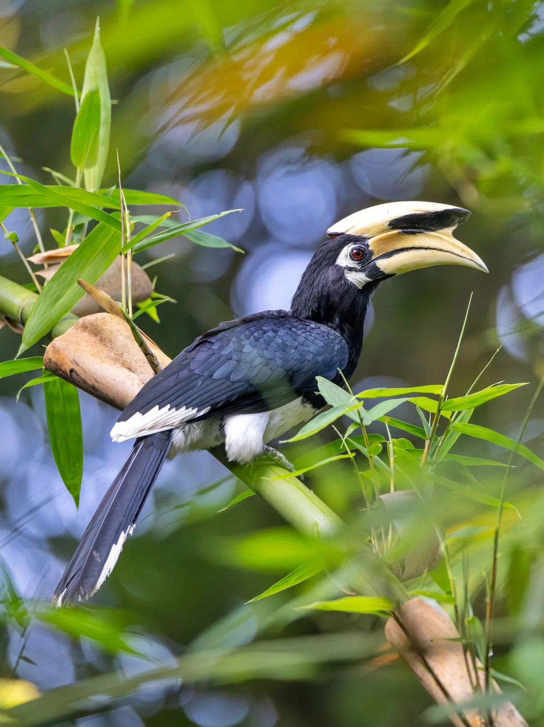原创拍摄 冠斑犀鸟,Oriental Pied Hornbill,犀鸟目犀鸟科斑犀鸟属。国家一级保护动物。主要分布于印度次大陆到东南亚,虽然在整个分布范围内数量比较稳定,但是在我国只分布在南方的云南和广西,而且在我国的分布数量在下降,在我国见到是比较难得的。在盈江县和南宁见过繁殖。 冠斑犀鸟是黑白色的犀鸟,白色的腹部和翼缘,有一个黄色带黑色基部的大喙和盔突。 这只犀鸟是我们在泰国观鸟驾驶的路上,偶然飞到车旁边的竹林里,停了几秒钟。在竹林里穿梭的犀鸟真是非常漂亮。