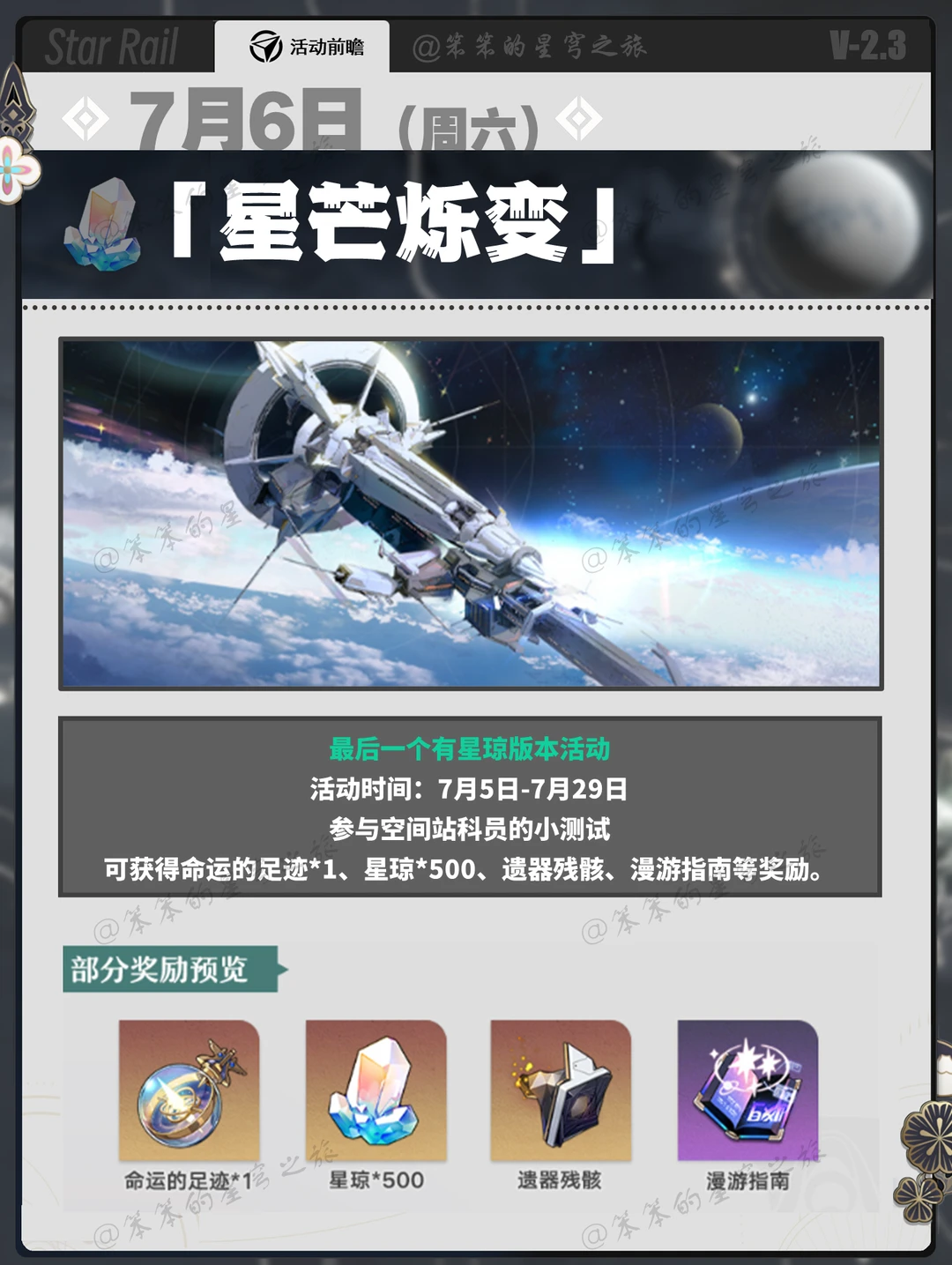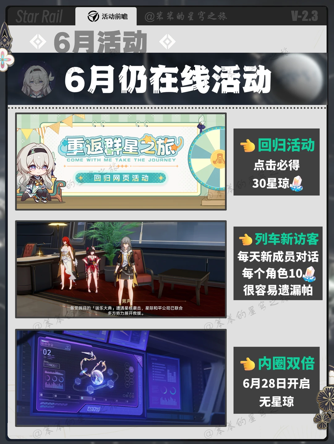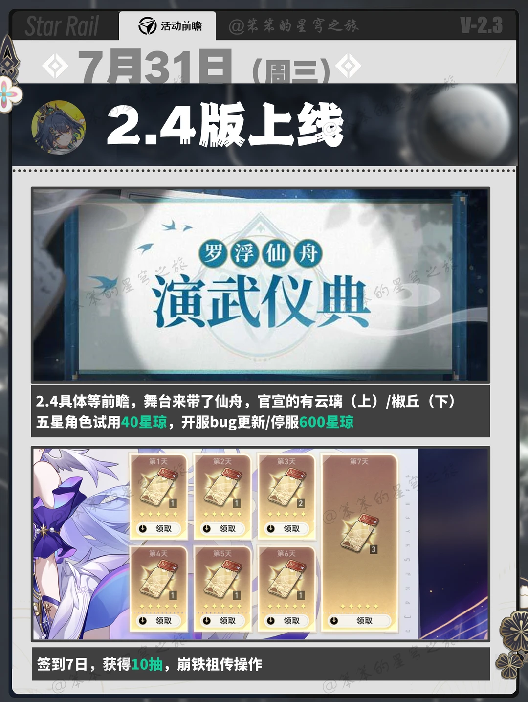 🐱大家好,我是笨笨的铲屎官 今天给大家带来的是7月的崩铁活动汇总 7月份是2.3版本的下半卡池 最大的信息就是翡翠会上线 7月的最后一天2.4会到来 目前2.4除了官宣的角色立绘外 其他内容还很少,等待前瞻直播 ------------------------------ 👉7月份你最期待什么