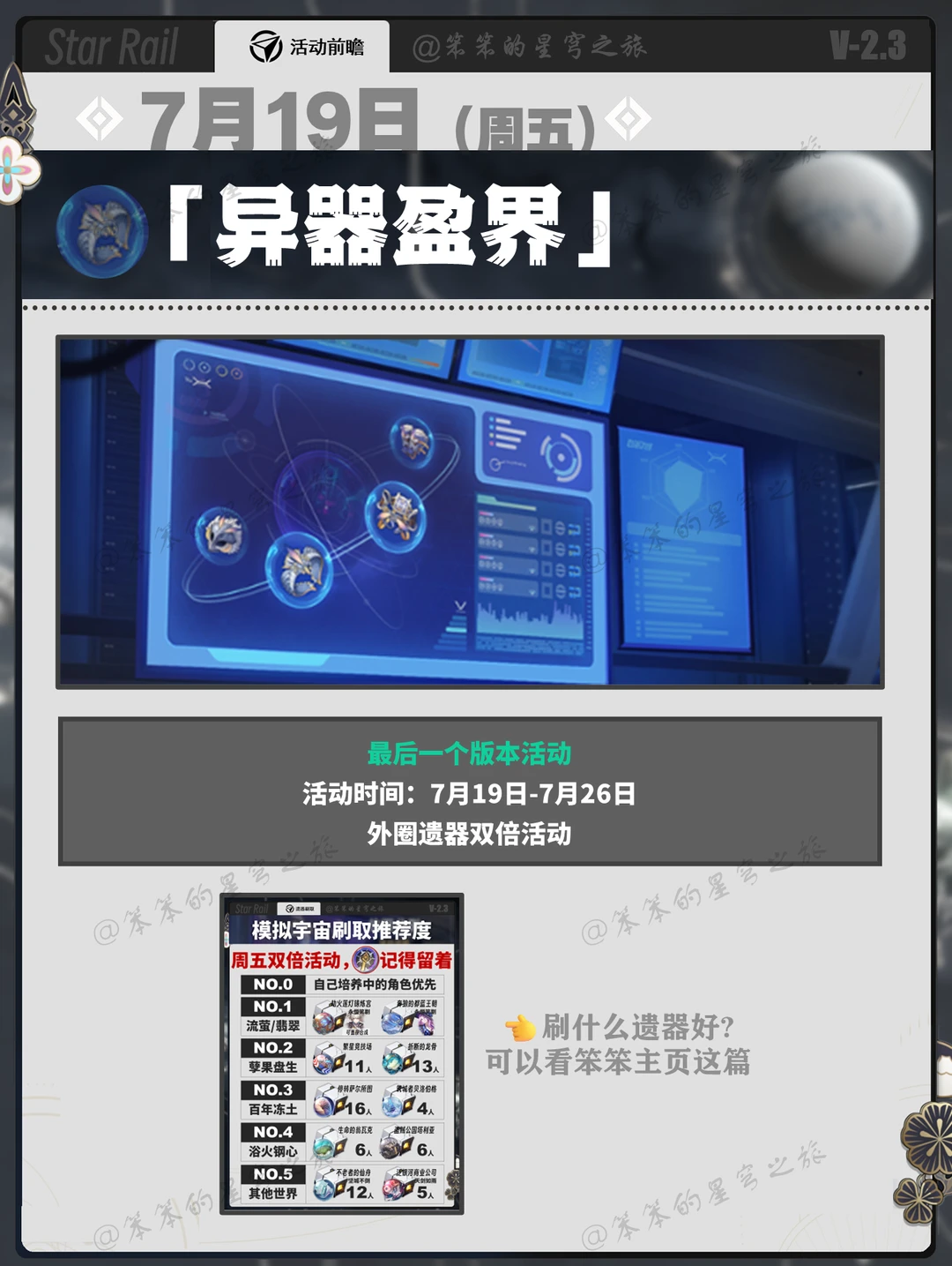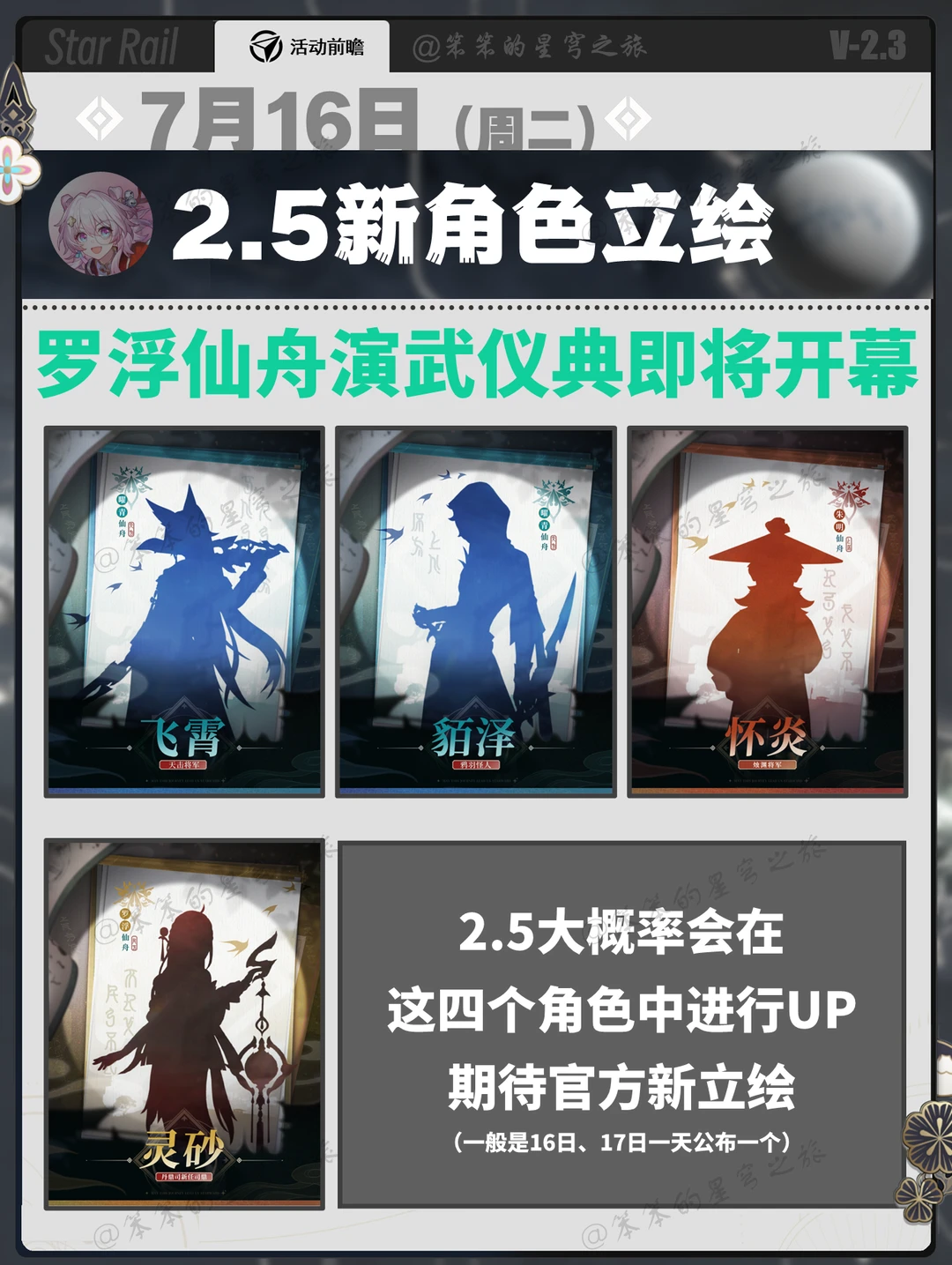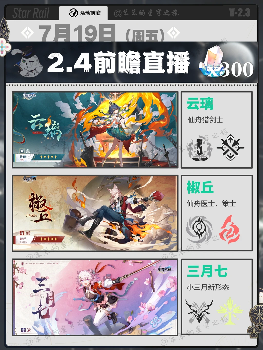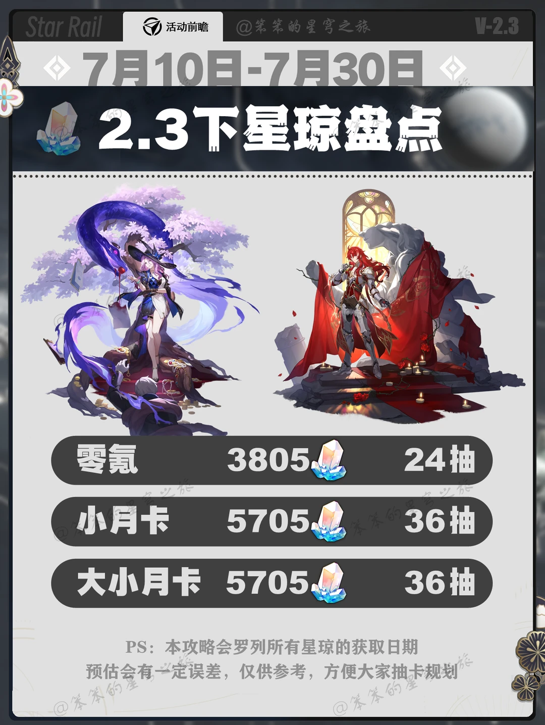🐱大家好,我是笨笨的铲屎官 今天给大家带来的是7月的崩铁活动汇总 7月份是2.3版本的下半卡池 最大的信息就是翡翠会上线 7月的最后一天2.4会到来 目前2.4除了官宣的角色立绘外 其他内容还很少,等待前瞻直播 ------------------------------ 👉7月份你最期待什么