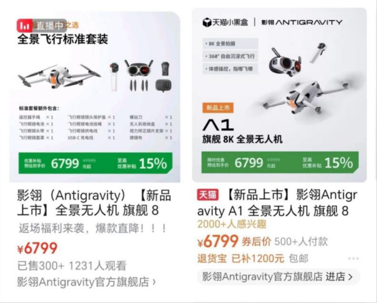 发售当晚,市场的反应并不热烈。据一点财经报道,截至12月7日,销售前三日数据显示,影翎A1在京东、淘宝和抖音三大主流电商平台的累计销量仅约1400台,对应营收约1000万元。这与影石某镜头供应商在投资交流会上表示的30万台销售目标相去甚远。