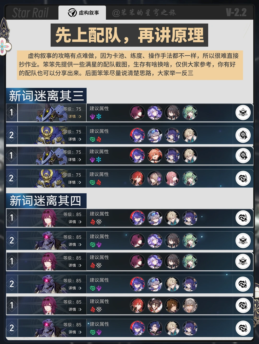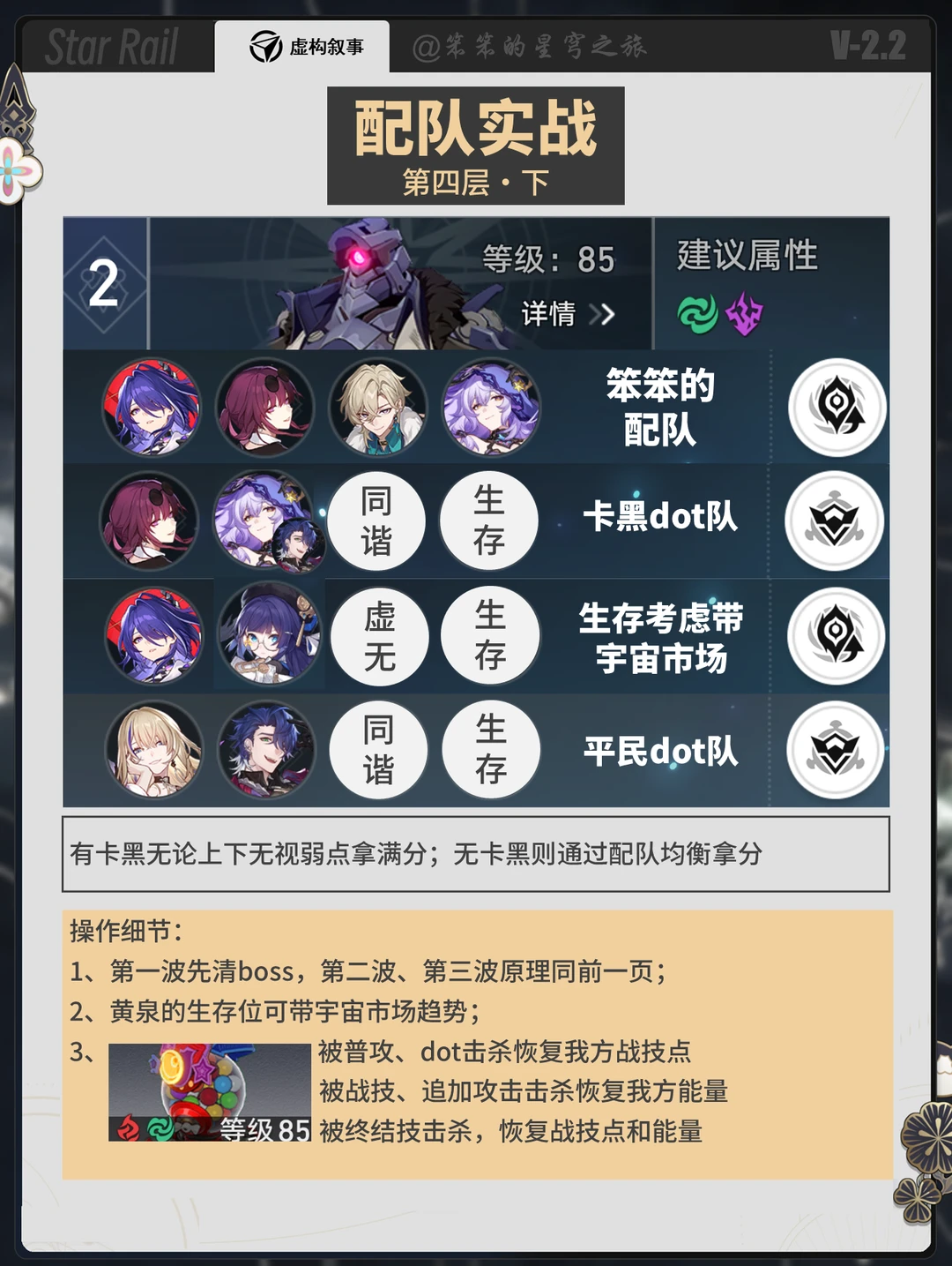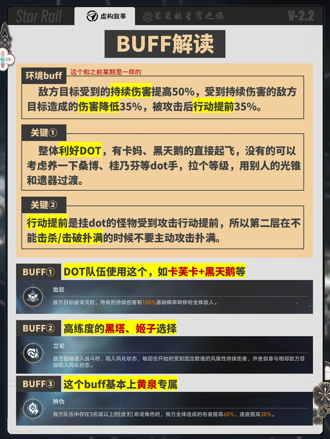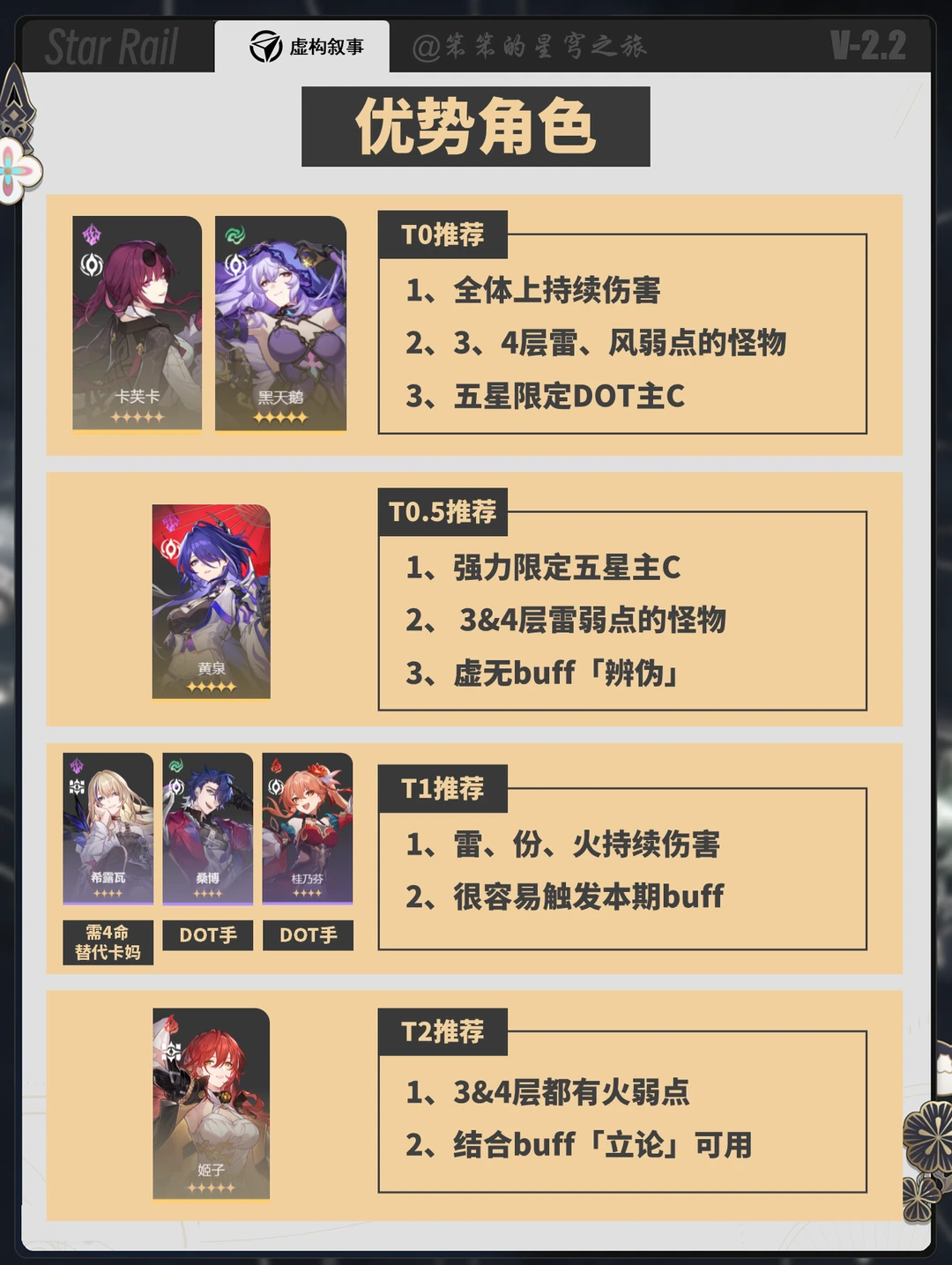 🐱大家好,我是笨笨的铲屎官 今天新的一期虚构叙事上线了 本期的增益buff利好dot伤害 卡芙卡+黑天鹅直接起飞 黄泉也非常好用 往期平民真神姬子依旧好用 本期黑塔没有很强的冰弱,能用但不算特别合适 ------------------------------- 💡虚构叙事的攻略有点难做 因为卡池、练度、操作手法都不一样 所以很难直接抄作业 所以笨笨尽量说清楚思路 大家举一反三,仅供参考 ➡最后,你有好的配队也可以分享出来