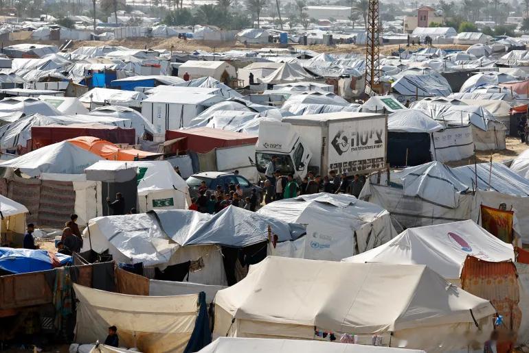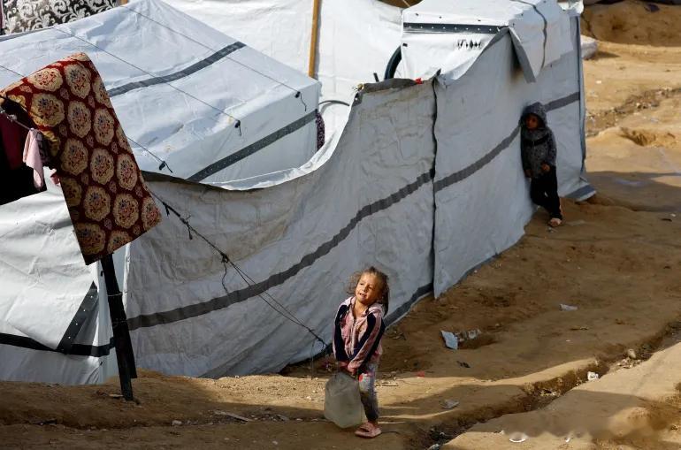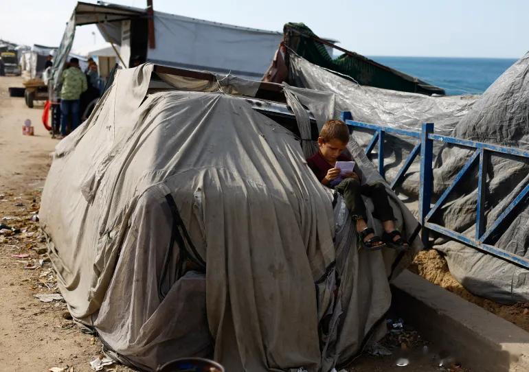 照片:在海边的流离失所营地,巴勒斯坦人正准备迎接冬季风暴图1 一名因以色列种族灭绝战争避难所而流离失所的巴勒斯坦妇女,位于加沙地带中部代尔巴拉的一个帐篷营地,2025年12月9日 [马哈茂德·伊萨/路透社]