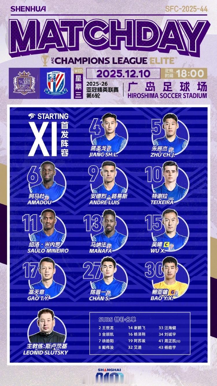 广岛三箭vs上海申花 坐落于广岛市区的和平之翼球场,申花客战广岛首发已出,全主力出战!上海申花首发:30-鲍亚雄、4-蒋圣龙、5-朱辰杰、13-马纳法、27-陈晋一、6-阿马杜、15-吴曦、17-高天意、9-安德烈·路易斯、10-特谢拉、11-绍洛-米内罗广岛三箭首发:1-大迫敬介、4-荒木隼人、13-新井直人、19-佐佐木翔、33-盐谷司、6-川边骏、14-田中聪、18-菅大辉、30-托尔加伊·阿尔斯兰、9-杰梅恩·良、39-中村草太